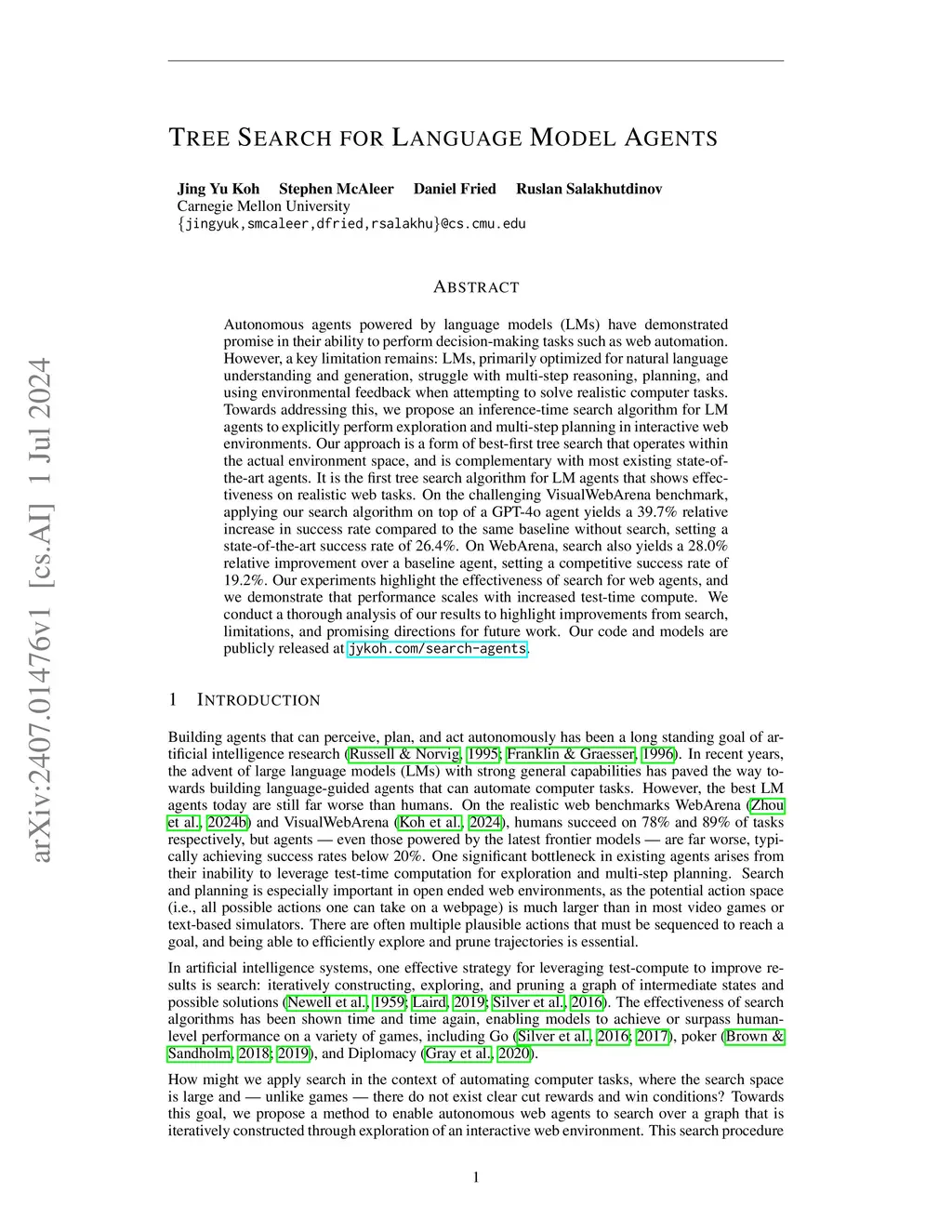 Autonomous agents powered by language models (LMs) have demonstrated promise in their ability to perform decision-making tasks such as web automation. However, a key limitation remains: LMs, primarily optimized for natural language understanding and generation, struggle with multi-step reasoning, planning, and using environmental feedback when attempting to solve realistic computer tasks. Towards addressing this, we propose an inference-time search algorithm for LM agents to explicitly perform exploration and multi-step planning in interactive web environments. Our approach is a form of best-first tree search that operates within the actual environment space, and is complementary with most existing state-of-the-art agents. It is the first tree search algorithm for LM agents that shows effectiveness on realistic web tasks. On the challenging VisualWebArena benchmark, applying our search algorithm on top of a GPT-4o agent yields a 39.7% relative increase in success rate compared to the same baseline without search, setting a state-of-the-art success rate of 26.4%. On WebArena, search also yields a 28.0% relative improvement over a baseline agent, setting a competitive success rate of 19.2%. Our experiments highlight the effectiveness of search for web agents, and we demonstrate that performance scales with increased test-time compute. We conduct a thorough analysis of our results to highlight improvements from search, limitations, and promising directions for future work. Our code and models are publicly released atthis https URL.