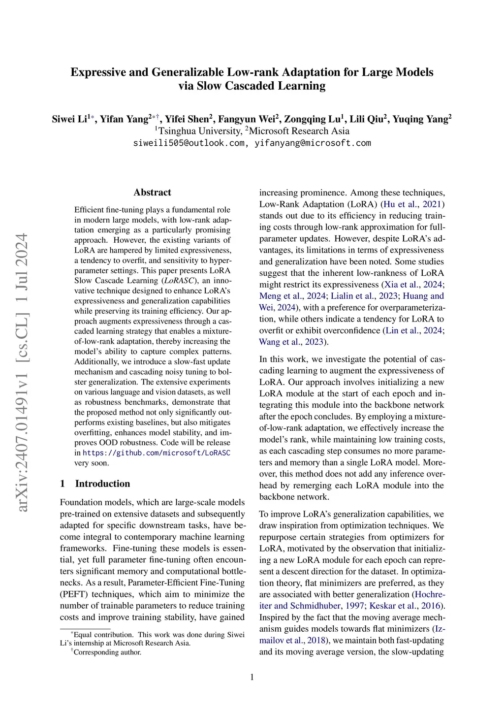 Efficient fine-tuning plays a fundamental role in modern large models, with low-rank adaptation emerging as a particularly promising approach. However, the existing variants of LoRA are hampered by limited expressiveness, a tendency to overfit, and sensitivity to hyperparameter settings. This paper presents LoRA Slow Cascade Learning (LoRASC), an innovative technique designed to enhance LoRA's expressiveness and generalization capabilities while preserving its training efficiency. Our approach augments expressiveness through a cascaded learning strategy that enables a mixture-of-low-rank adaptation, thereby increasing the model's ability to capture complex patterns. Additionally, we introduce a slow-fast update mechanism and cascading noisy tuning to bolster generalization. The extensive experiments on various language and vision datasets, as well as robustness benchmarks, demonstrate that the proposed method not only significantly outperforms existing baselines, but also mitigates overfitting, enhances model stability, and improves OOD robustness. Code will be release in https://github.com/microsoft/LoRASC very soon.