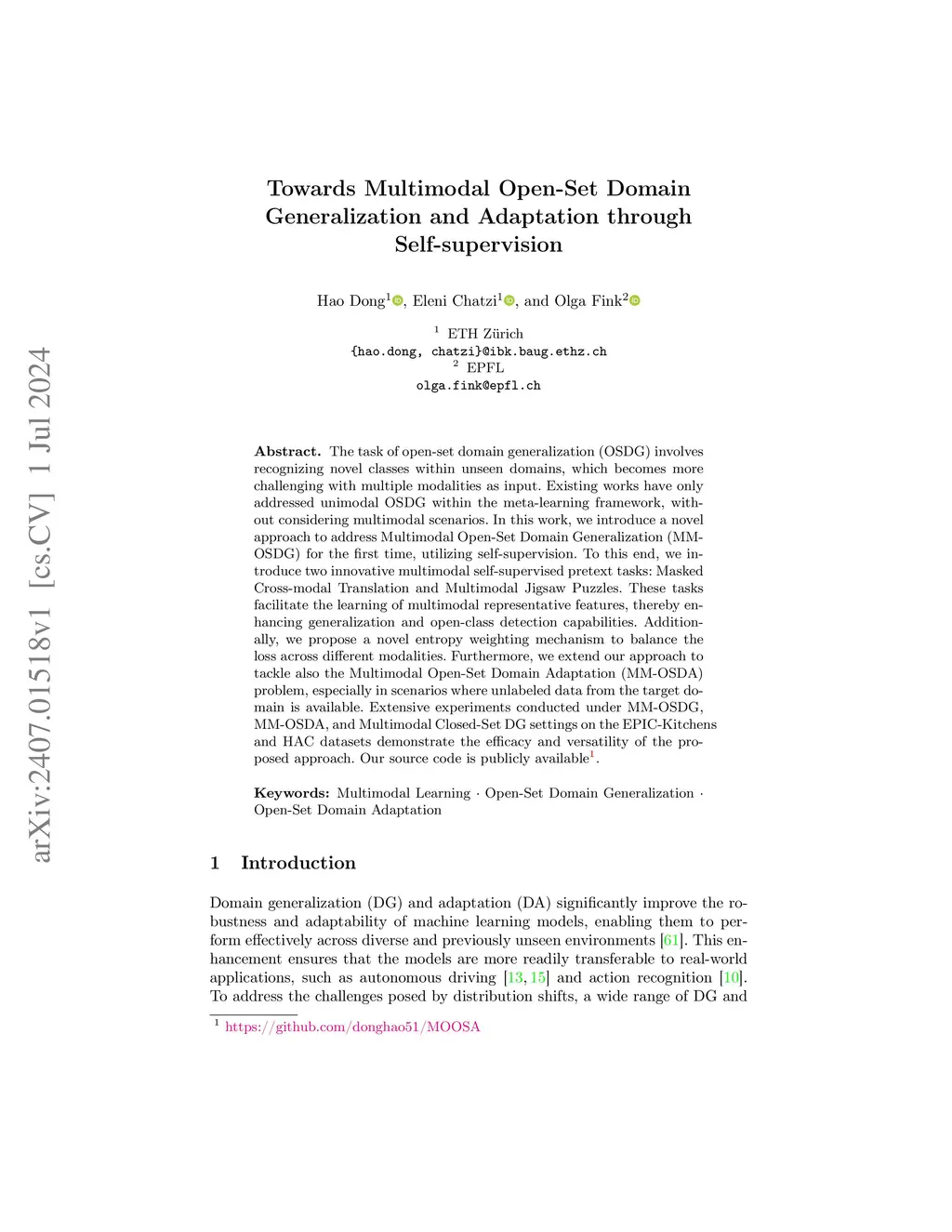 The task of open-set domain generalization (OSDG) involves recognizing novel classes within unseen domains, which becomes more challenging with multiple modalities as input. Existing works have only addressed unimodal OSDG within the meta-learning framework, without considering multimodal scenarios. In this work, we introduce a novel approach to address Multimodal Open-Set Domain Generalization (MM-OSDG) for the first time, utilizing self-supervision. To this end, we introduce two innovative multimodal self-supervised pretext tasks: Masked Cross-modal Translation and Multimodal Jigsaw Puzzles. These tasks facilitate the learning of multimodal representative features, thereby enhancing generalization and open-class detection capabilities. Additionally, we propose a novel entropy weighting mechanism to balance the loss across different modalities. Furthermore, we extend our approach to tackle also the Multimodal Open-Set Domain Adaptation (MM-OSDA) problem, especially in scenarios where unlabeled data from the target domain is available. Extensive experiments conducted under MM-OSDG, MM-OSDA, and Multimodal Closed-Set DG settings on the EPIC-Kitchens and HAC datasets demonstrate the efficacy and versatility of the proposed approach. Our source code is available at https://github.com/donghao51/MOOSA.