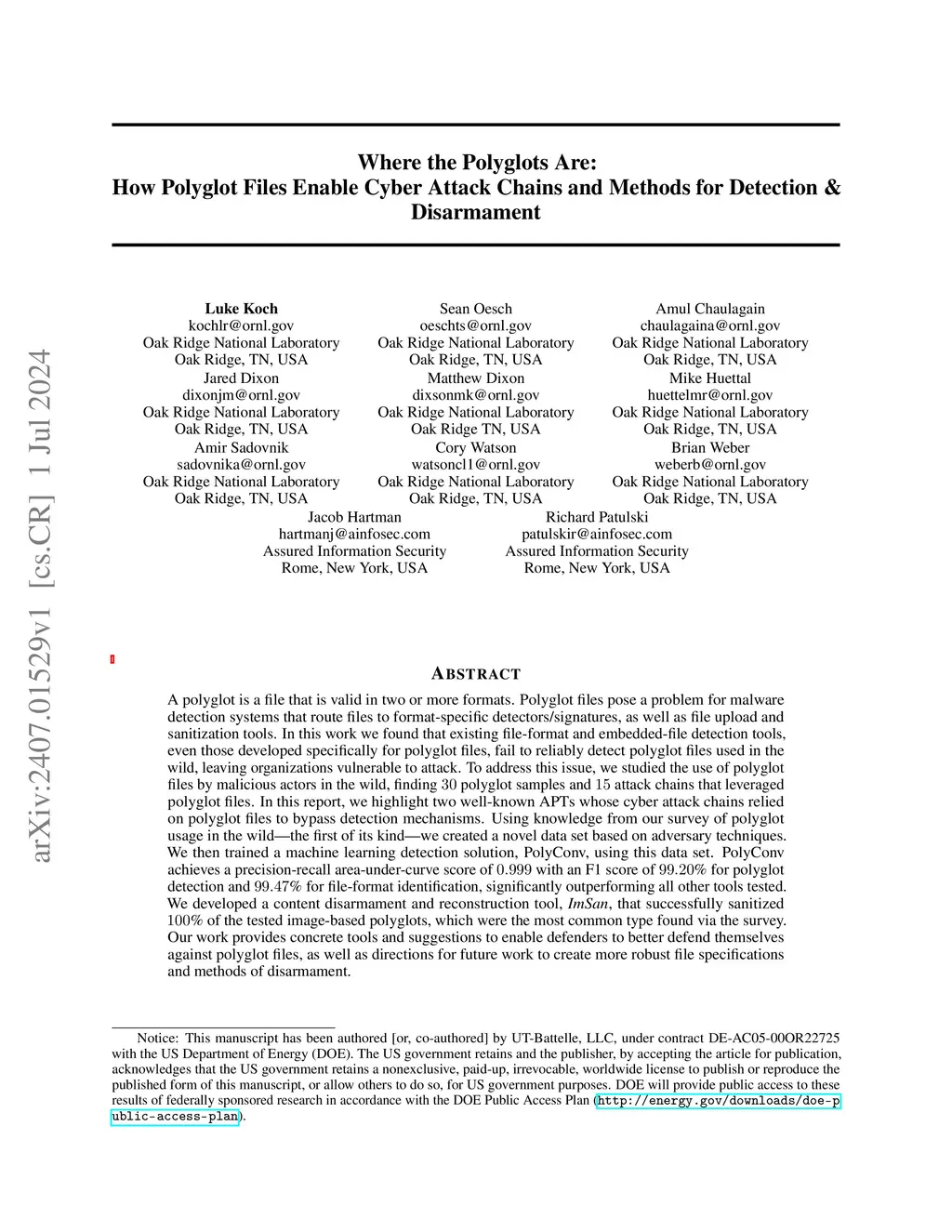 A polyglot is a file that is valid in two or more formats. Polyglot files pose a problem for malware detection systems that route files to format-specific detectors/signatures, as well as file upload and sanitization tools. In this work we found that existing file-format and embedded-file detection tools, even those developed specifically for polyglot files, fail to reliably detect polyglot files used in the wild, leaving organizations vulnerable to attack. To address this issue, we studied the use of polyglot files by malicious actors in the wild, finding polyglot samples and attack chains that leveraged polyglot files. In this report, we highlight two well-known APTs whose cyber attack chains relied on polyglot files to bypass detection mechanisms. Using knowledge from our survey of polyglot usage in the wild -- the first of its kind -- we created a novel data set based on adversary techniques. We then trained a machine learning detection solution, PolyConv, using this data set. PolyConv achieves a precision-recall area-under-curve score of with an F1 score of % for polyglot detection and % for file-format identification, significantly outperforming all other tools tested. We developed a content disarmament and reconstruction tool, ImSan, that successfully sanitized % of the tested image-based polyglots, which were the most common type found via the survey. Our work provides concrete tools and suggestions to enable defenders to better defend themselves against polyglot files, as well as directions for future work to create more robust file specifications and methods of disarmament.