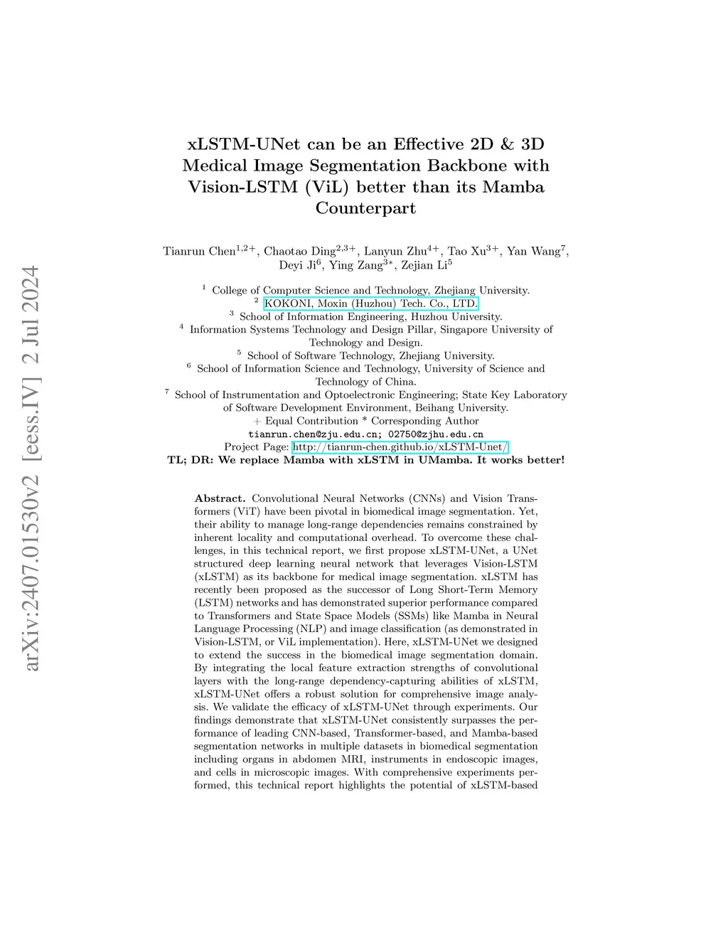 Convolutional Neural Networks (CNNs) and Vision Transformers (ViT) have been pivotal in biomedical image segmentation, yet their ability to manage long-range dependencies remains constrained by inherent locality and computational overhead. To overcome these challenges, in this technical report, we first propose xLSTM-UNet, a UNet structured deep learning neural network that leverages Vision-LSTM (xLSTM) as its backbone for medical image segmentation. xLSTM is a recently proposed as the successor of Long Short-Term Memory (LSTM) networks and have demonstrated superior performance compared to Transformers and State Space Models (SSMs) like Mamba in Neural Language Processing (NLP) and image classification (as demonstrated in Vision-LSTM, or ViL implementation). Here, xLSTM-UNet we designed extend the success in biomedical image segmentation domain. By integrating the local feature extraction strengths of convolutional layers with the long-range dependency capturing abilities of xLSTM, xLSTM-UNet offers a robust solution for comprehensive image analysis. We validate the efficacy of xLSTM-UNet through experiments. Our findings demonstrate that xLSTM-UNet consistently surpasses the performance of leading CNN-based, Transformer-based, and Mamba-based segmentation networks in multiple datasets in biomedical segmentation including organs in abdomen MRI, instruments in endoscopic images, and cells in microscopic images. With comprehensive experiments performed, this technical report highlights the potential of xLSTM-based architectures in advancing biomedical image analysis in both 2D and 3D. The code, models, and datasets are publicly available at http://tianrun-chen.github.io/xLSTM-UNet/