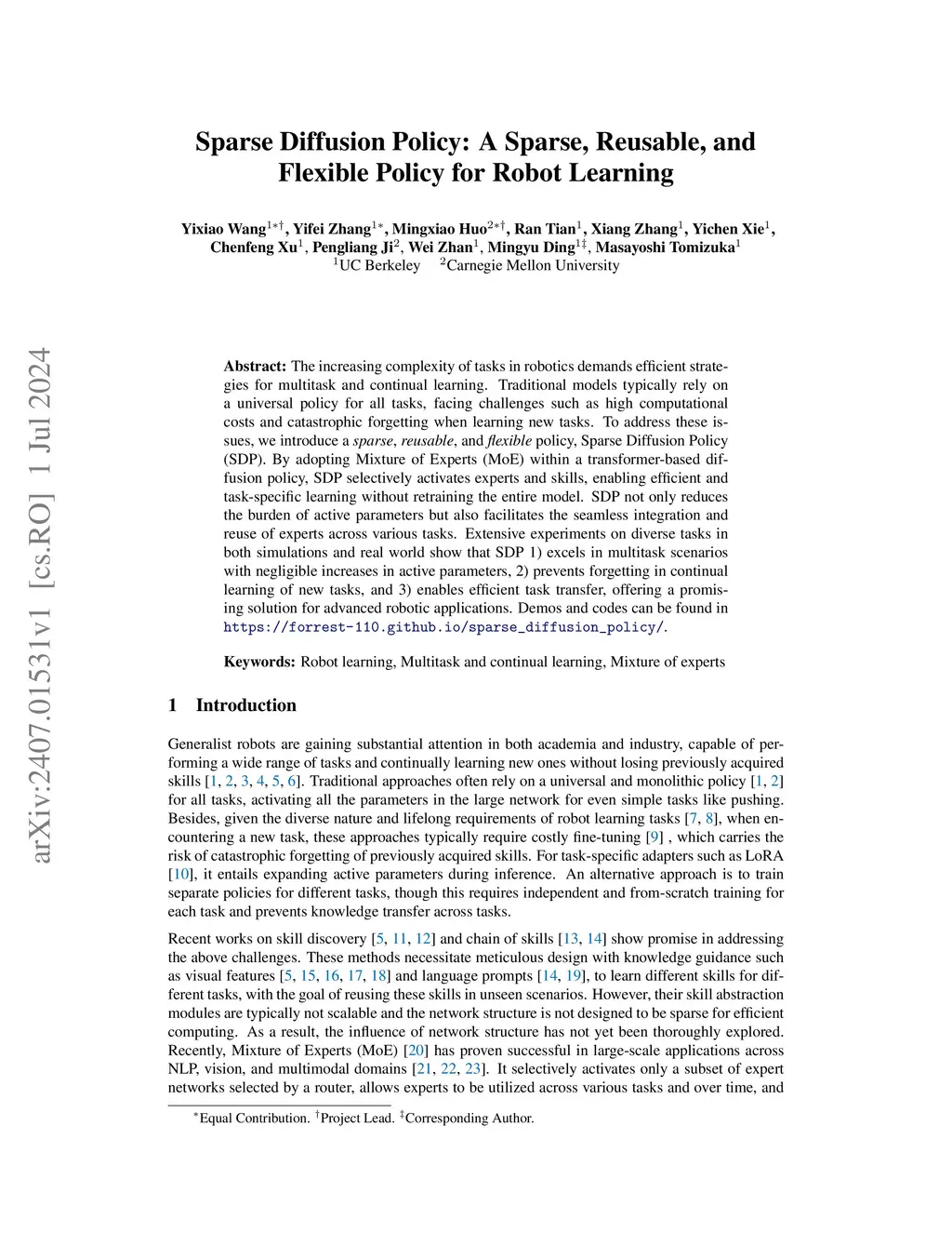 The increasing complexity of tasks in robotics demands efficient strategies for multitask and continual learning. Traditional models typically rely on a universal policy for all tasks, facing challenges such as high computational costs and catastrophic forgetting when learning new tasks. To address these issues, we introduce a sparse, reusable, and flexible policy, Sparse Diffusion Policy (SDP). By adopting Mixture of Experts (MoE) within a transformer-based diffusion policy, SDP selectively activates experts and skills, enabling efficient and task-specific learning without retraining the entire model. SDP not only reduces the burden of active parameters but also facilitates the seamless integration and reuse of experts across various tasks. Extensive experiments on diverse tasks in both simulations and real world show that SDP 1) excels in multitask scenarios with negligible increases in active parameters, 2) prevents forgetting in continual learning of new tasks, and 3) enables efficient task transfer, offering a promising solution for advanced robotic applications. Demos and codes can be found in https://forrest-110.github.io/sparse_diffusion_policy/.