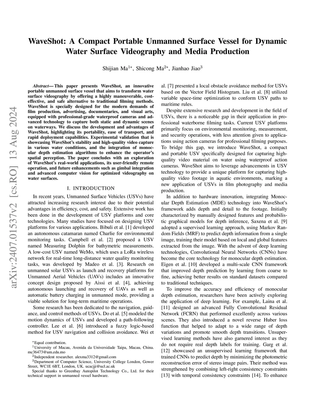 This paper presents WaveShot, an innovative portable unmanned surface vessel that aims to transform water surface videography by offering a highly maneuverable, cost-effective, and safe alternative to traditional filming methods. WaveShot is designed for the modern demands of film production, advertising, documentaries, and visual arts, equipped with professional-grade waterproof cameras and advanced technology to capture static and dynamic scenes on waterways. We discuss the development and advantages of WaveShot, highlighting its portability, ease of transport, and rapid deployment capabilities. Experimental validation showcasing WaveShot's stability and high-quality video capture in various water conditions, and the integration of monocular depth estimation algorithms to enhance the operator's spatial perception. The paper concludes by exploring WaveShot's real-world applications, its user-friendly remote operation, and future enhancements such as gimbal integration and advanced computer vision for optimized videography on water surfaces.