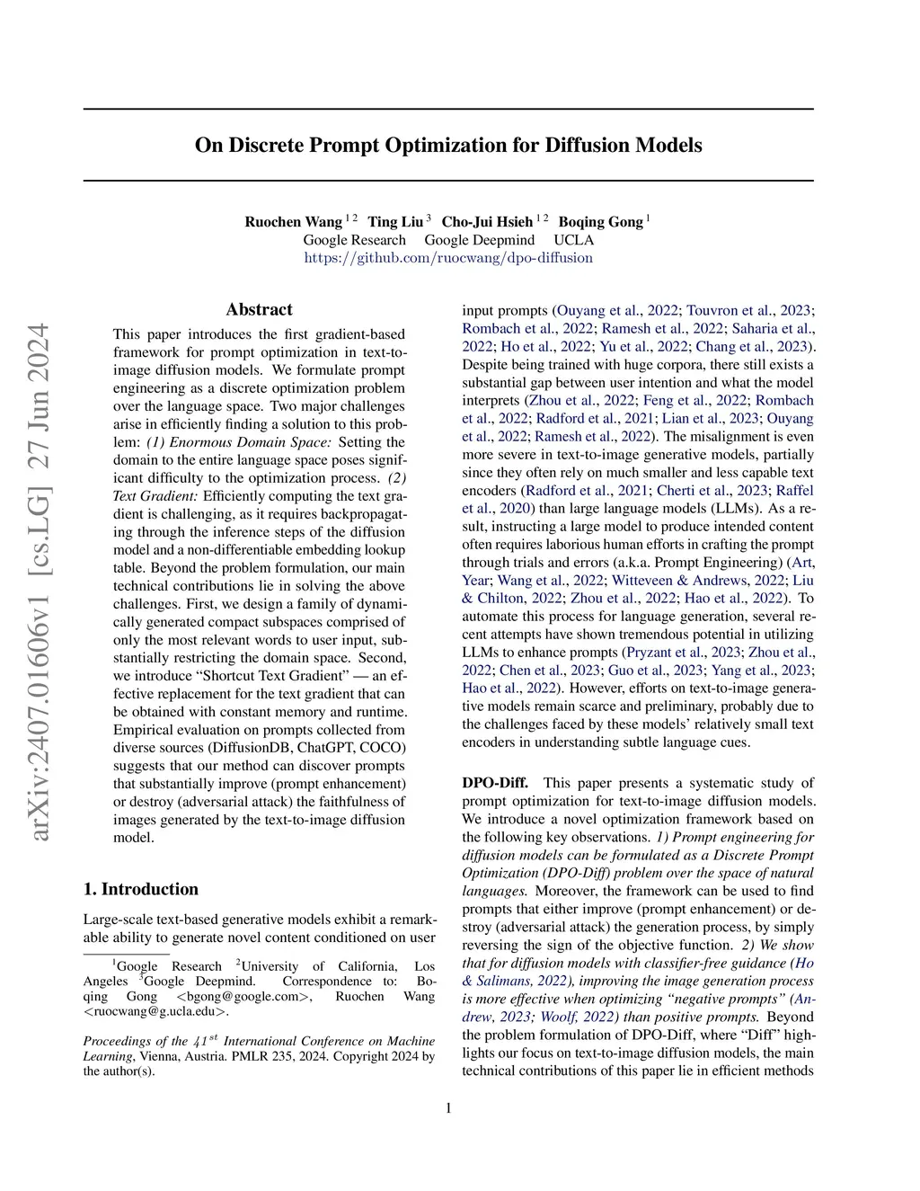 This paper introduces the first gradient-based framework for prompt optimization in text-to-image diffusion models. We formulate prompt engineering as a discrete optimization problem over the language space. Two major challenges arise in efficiently finding a solution to this problem: (1) Enormous Domain Space: Setting the domain to the entire language space poses significant difficulty to the optimization process. (2) Text Gradient: Efficiently computing the text gradient is challenging, as it requires backpropagating through the inference steps of the diffusion model and a non-differentiable embedding lookup table. Beyond the problem formulation, our main technical contributions lie in solving the above challenges. First, we design a family of dynamically generated compact subspaces comprised of only the most relevant words to user input, substantially restricting the domain space. Second, we introduce "Shortcut Text Gradient" -- an effective replacement for the text gradient that can be obtained with constant memory and runtime. Empirical evaluation on prompts collected from diverse sources (DiffusionDB, ChatGPT, COCO) suggests that our method can discover prompts that substantially improve (prompt enhancement) or destroy (adversarial attack) the faithfulness of images generated by the text-to-image diffusion model.