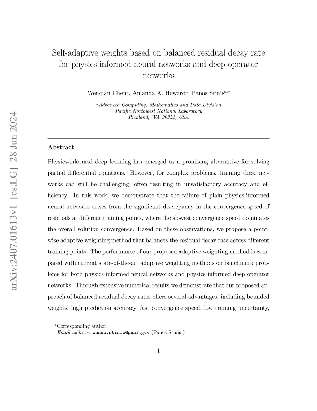 Physics-informed deep learning has emerged as a promising alternative for solving partial differential equations. However, for complex problems, training these networks can still be challenging, often resulting in unsatisfactory accuracy and efficiency. In this work, we demonstrate that the failure of plain physics-informed neural networks arises from the significant discrepancy in the convergence rate of residuals at different training points, where the slowest convergence rate dominates the overall solution convergence. Based on these observations, we propose a pointwise adaptive weighting method that balances the residual decay rate across different training points. The performance of our proposed adaptive weighting method is compared with current state-of-the-art adaptive weighting methods on benchmark problems for both physics-informed neural networks and physics-informed deep operator networks. Through extensive numerical results we demonstrate that our proposed approach of balanced residual decay rates offers several advantages, including bounded weights, high prediction accuracy, fast convergence rate, low training uncertainty, low computational cost, and ease of hyperparameter tuning.