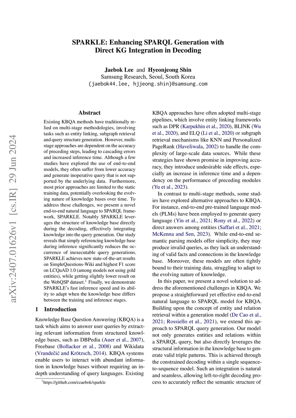 Existing KBQA methods have traditionally relied on multi-stage methodologies, involving tasks such as entity linking, subgraph retrieval and query structure generation. However, multi-stage approaches are dependent on the accuracy of preceding steps, leading to cascading errors and increased inference time. Although a few studies have explored the use of end-to-end models, they often suffer from lower accuracy and generate inoperative query that is not supported by the underlying data. Furthermore, most prior approaches are limited to the static training data, potentially overlooking the evolving nature of knowledge bases over time. To address these challenges, we present a novel end-to-end natural language to SPARQL framework, SPARKLE. Notably SPARKLE leverages the structure of knowledge base directly during the decoding, effectively integrating knowledge into the query generation. Our study reveals that simply referencing knowledge base during inference significantly reduces the occurrence of inexecutable query generations. SPARKLE achieves new state-of-the-art results on SimpleQuestions-Wiki and highest F1 score on LCQuAD 1.0 (among models not using gold entities), while getting slightly lower result on the WebQSP dataset. Finally, we demonstrate SPARKLE's fast inference speed and its ability to adapt when the knowledge base differs between the training and inference stages.