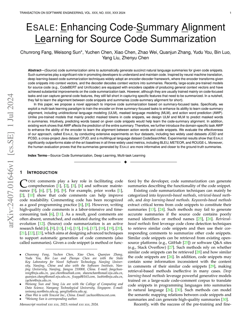 ESALE: Enhancing Code-Summary Alignment Learning for Source Code