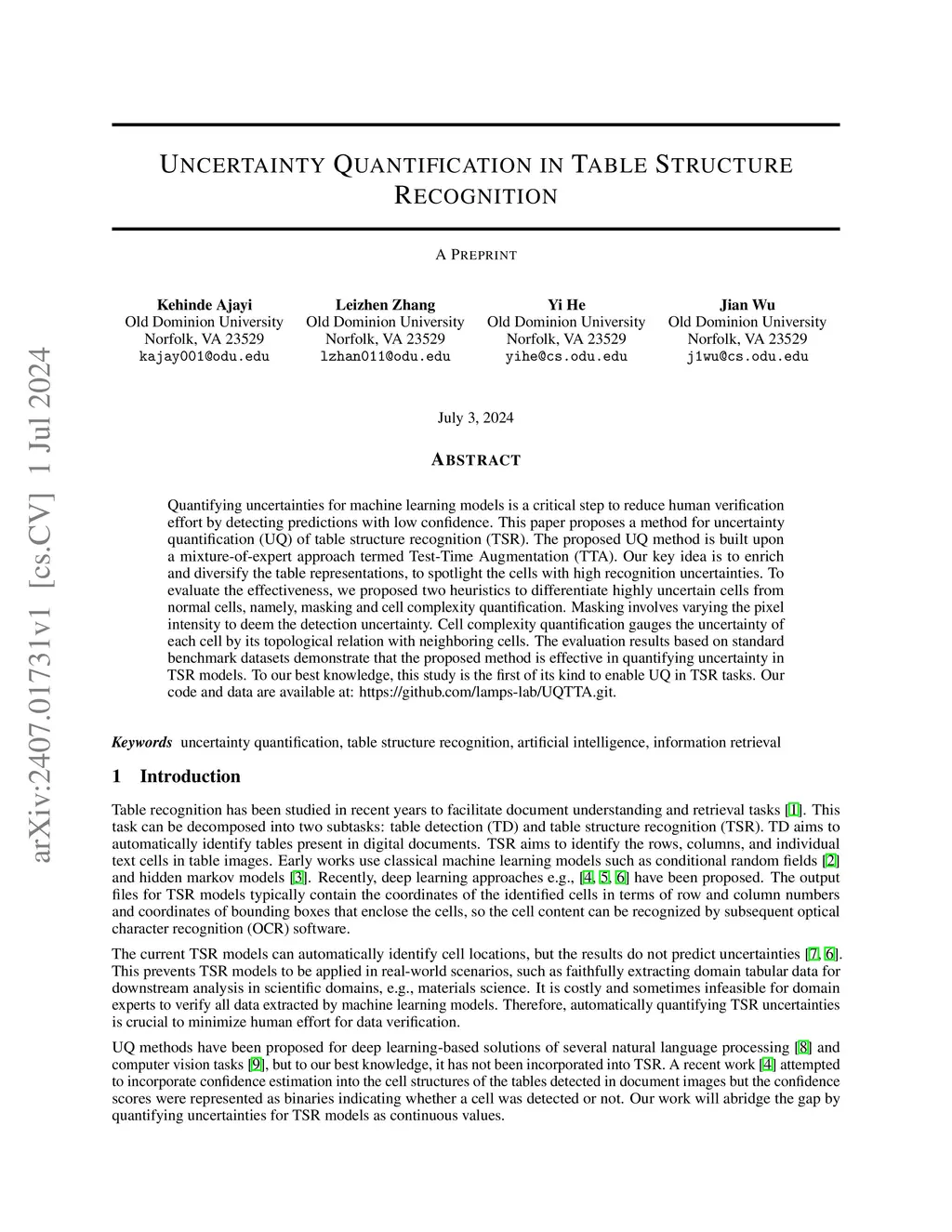 Quantifying uncertainties for machine learning models is a critical step to reduce human verification effort by detecting predictions with low confidence. This paper proposes a method for uncertainty quantification (UQ) of table structure recognition (TSR). The proposed UQ method is built upon a mixture-of-expert approach termed Test-Time Augmentation (TTA). Our key idea is to enrich and diversify the table representations, to spotlight the cells with high recognition uncertainties. To evaluate the effectiveness, we proposed two heuristics to differentiate highly uncertain cells from normal cells, namely, masking and cell complexity quantification. Masking involves varying the pixel intensity to deem the detection uncertainty. Cell complexity quantification gauges the uncertainty of each cell by its topological relation with neighboring cells. The evaluation results based on standard benchmark datasets demonstrate that the proposed method is effective in quantifying uncertainty in TSR models. To our best knowledge, this study is the first of its kind to enable UQ in TSR tasks. Our code and data are available at: https://github.com/lamps-lab/UQTTA.git.