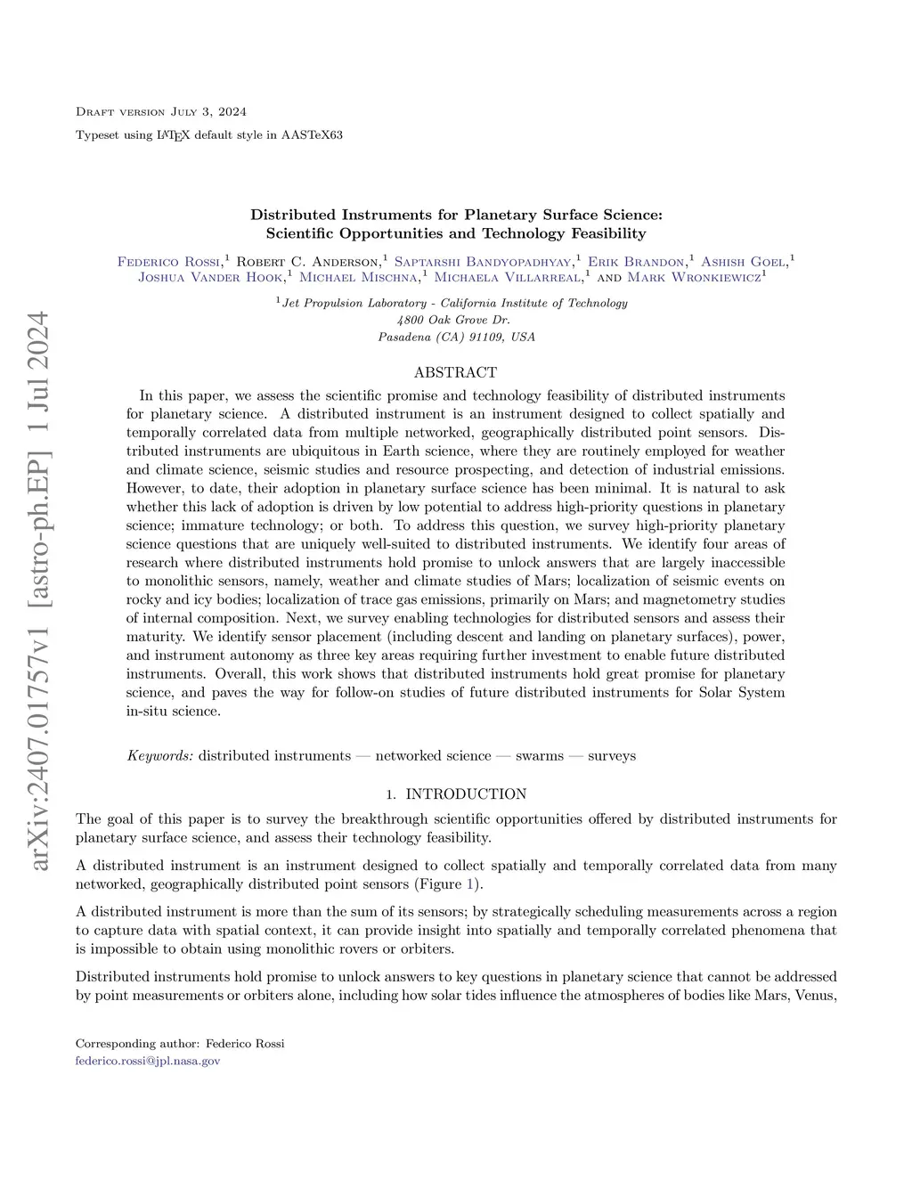 In this paper, we assess the scientific promise and technology feasibility of distributed instruments for planetary science. A distributed instrument is an instrument designed to collect spatially and temporally correlated data from multiple networked, geographically distributed point sensors. Distributed instruments are ubiquitous in Earth science, where they are routinely employed for weather and climate science, seismic studies and resource prospecting, and detection of industrial emissions. However, to date, their adoption in planetary surface science has been minimal. It is natural to ask whether this lack of adoption is driven by low potential to address high-priority questions in planetary science; immature technology; or both. To address this question, we survey high-priority planetary science questions that are uniquely well-suited to distributed instruments. We identify four areas of research where distributed instruments hold promise to unlock answers that are largely inaccessible to monolithic sensors, namely, weather and climate studies of Mars; localization of seismic events on rocky and icy bodies; localization of trace gas emissions, primarily on Mars; and magnetometry studies of internal composition. Next, we survey enabling technologies for distributed sensors and assess their maturity. We identify sensor placement (including descent and landing on planetary surfaces), power, and instrument autonomy as three key areas requiring further investment to enable future distributed instruments. Overall, this work shows that distributed instruments hold great promise for planetary science, and paves the way for follow-on studies of future distributed instruments for Solar System in-situ science.