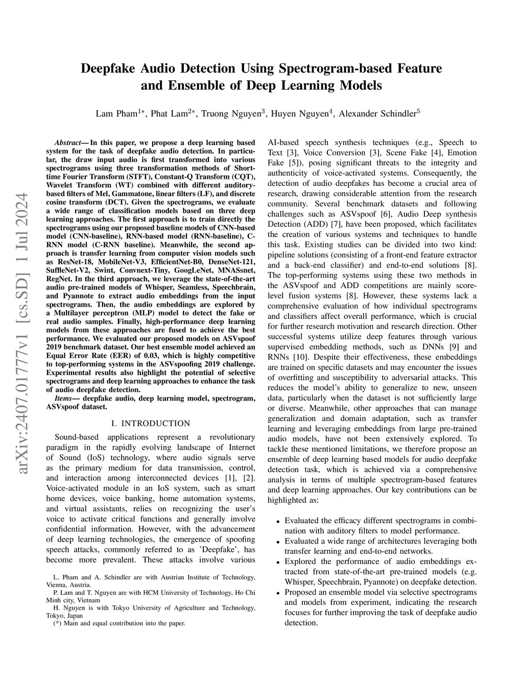 In this paper, we propose a deep learning based system for the task of deepfake audio detection. In particular, the draw input audio is first transformed into various spectrograms using three transformation methods of Short-time Fourier Transform (STFT), Constant-Q Transform (CQT), Wavelet Transform (WT) combined with different auditory-based filters of Mel, Gammatone, linear filters (LF), and discrete cosine transform (DCT). Given the spectrograms, we evaluate a wide range of classification models based on three deep learning approaches. The first approach is to train directly the spectrograms using our proposed baseline models of CNN-based model (CNN-baseline), RNN-based model (RNN-baseline), C-RNN model (C-RNN baseline). Meanwhile, the second approach is transfer learning from computer vision models such as ResNet-18, MobileNet-V3, EfficientNet-B0, DenseNet-121, SuffleNet-V2, Swint, Convnext-Tiny, GoogLeNet, MNASsnet, RegNet. In the third approach, we leverage the state-of-the-art audio pre-trained models of Whisper, Seamless, Speechbrain, and Pyannote to extract audio embeddings from the input spectrograms. Then, the audio embeddings are explored by a Multilayer perceptron (MLP) model to detect the fake or real audio samples. Finally, high-performance deep learning models from these approaches are fused to achieve the best performance. We evaluated our proposed models on ASVspoof 2019 benchmark dataset. Our best ensemble model achieved an Equal Error Rate (EER) of 0.03, which is highly competitive to top-performing systems in the ASVspoofing 2019 challenge. Experimental results also highlight the potential of selective spectrograms and deep learning approaches to enhance the task of audio deepfake detection.