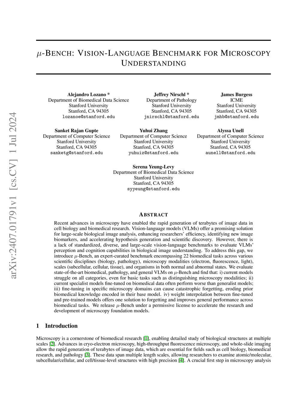 Recent advances in microscopy have enabled the rapid generation of terabytes of image data in cell biology and biomedical research. Vision-language models (VLMs) offer a promising solution for large-scale biological image analysis, enhancing researchers' efficiency, identifying new image biomarkers, and accelerating hypothesis generation and scientific discovery. However, there is a lack of standardized, diverse, and large-scale vision-language benchmarks to evaluate VLMs' perception and cognition capabilities in biological image understanding. To address this gap, we introduce {\mu}-Bench, an expert-curated benchmark encompassing 22 biomedical tasks across various scientific disciplines (biology, pathology), microscopy modalities (electron, fluorescence, light), scales (subcellular, cellular, tissue), and organisms in both normal and abnormal states. We evaluate state-of-the-art biomedical, pathology, and general VLMs on {\mu}-Bench and find that: i) current models struggle on all categories, even for basic tasks such as distinguishing microscopy modalities; ii) current specialist models fine-tuned on biomedical data often perform worse than generalist models; iii) fine-tuning in specific microscopy domains can cause catastrophic forgetting, eroding prior biomedical knowledge encoded in their base model. iv) weight interpolation between fine-tuned and pre-trained models offers one solution to forgetting and improves general performance across biomedical tasks. We release {\mu}-Bench under a permissive license to accelerate the research and development of microscopy foundation models.