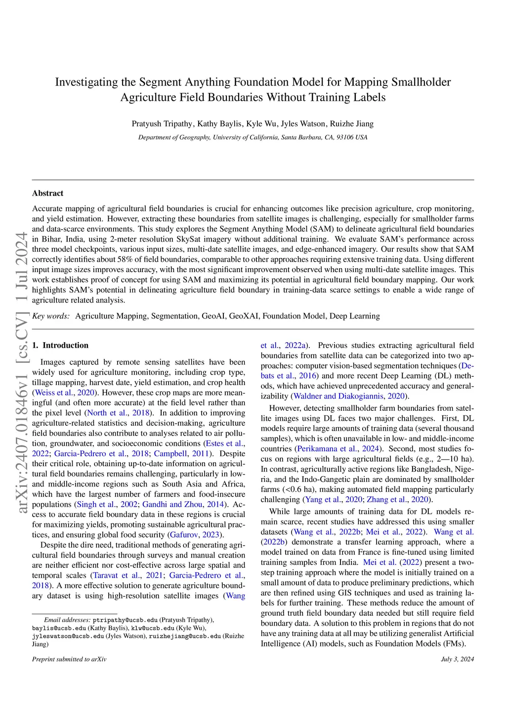 Accurate mapping of agricultural field boundaries is crucial for enhancing outcomes like precision agriculture, crop monitoring, and yield estimation. However, extracting these boundaries from satellite images is challenging, especially for smallholder farms and data-scarce environments. This study explores the Segment Anything Model (SAM) to delineate agricultural field boundaries in Bihar, India, using 2-meter resolution SkySat imagery without additional training. We evaluate SAM's performance across three model checkpoints, various input sizes, multi-date satellite images, and edge-enhanced imagery. Our results show that SAM correctly identifies about 58% of field boundaries, comparable to other approaches requiring extensive training data. Using different input image sizes improves accuracy, with the most significant improvement observed when using multi-date satellite images. This work establishes proof of concept for using SAM and maximizing its potential in agricultural field boundary mapping. Our work highlights SAM's potential in delineating agriculture field boundary in training-data scarce settings to enable a wide range of agriculture related analysis.