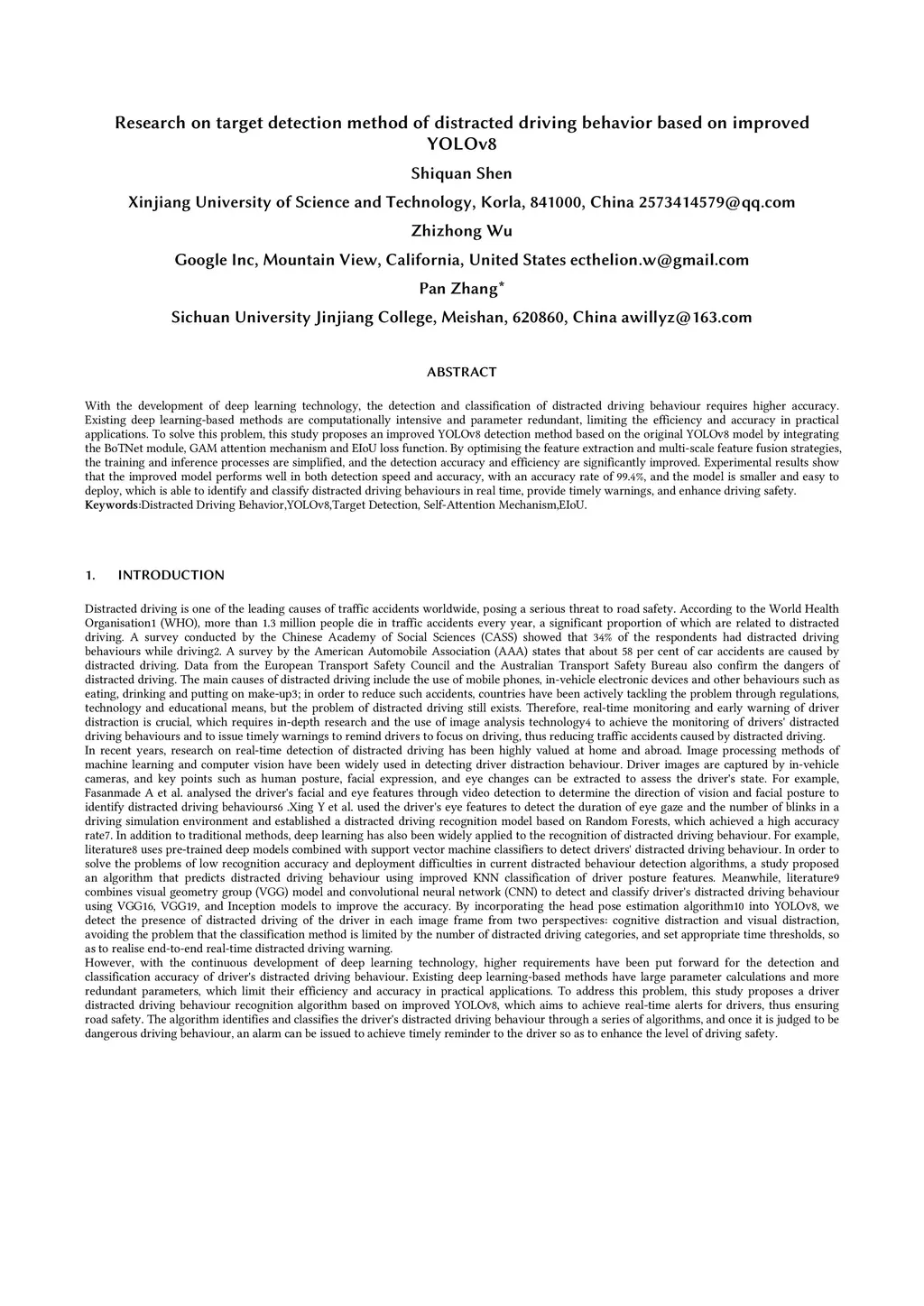With the development of deep learning technology, the detection and classification of distracted driving behaviour requires higher accuracy. Existing deep learning-based methods are computationally intensive and parameter redundant, limiting the efficiency and accuracy in practical applications. To solve this problem, this study proposes an improved YOLOv8 detection method based on the original YOLOv8 model by integrating the BoTNet module, GAM attention mechanism and EIoU loss function. By optimising the feature extraction and multi-scale feature fusion strategies, the training and inference processes are simplified, and the detection accuracy and efficiency are significantly improved. Experimental results show that the improved model performs well in both detection speed and accuracy, with an accuracy rate of 99.4%, and the model is smaller and easy to deploy, which is able to identify and classify distracted driving behaviours in real time, provide timely warnings, and enhance driving safety.