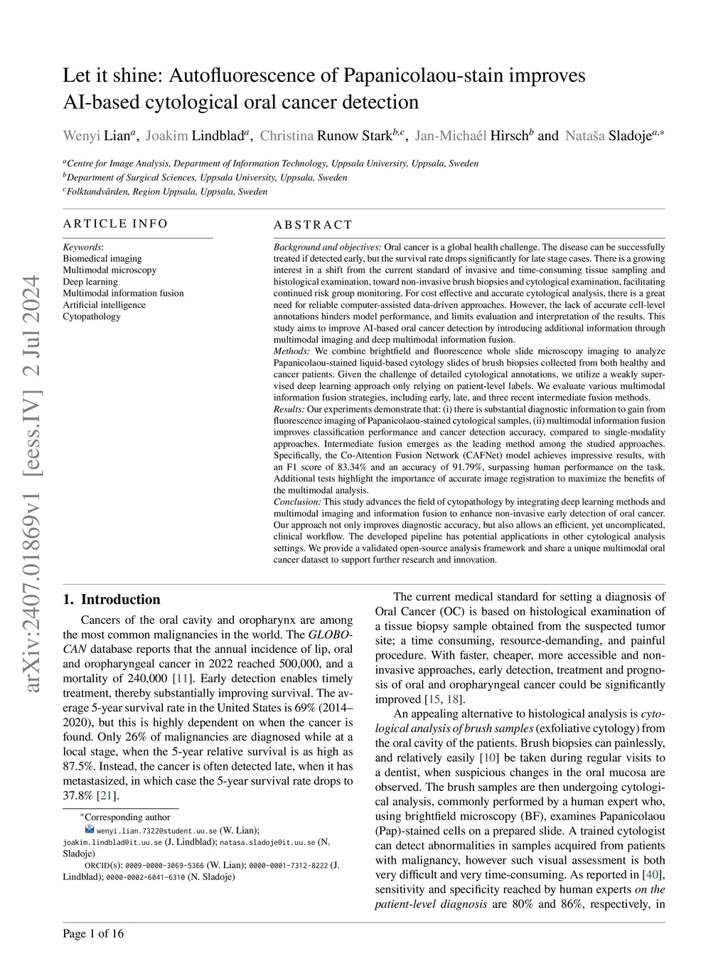 Oral cancer is a global health challenge. It is treatable if detected early, but it is often fatal in late stages. There is a shift from the invasive and time-consuming tissue sampling and histological examination, toward non-invasive brush biopsies and cytological examination. Reliable computer-assisted methods are essential for cost-effective and accurate cytological analysis, but the lack of detailed cell-level annotations impairs model effectiveness. This study aims to improve AI-based oral cancer detection using multimodal imaging and deep fusion. We combine brightfield and fluorescence whole slide microscopy imaging to analyze Papanicolaou-stained liquid-based cytology slides of brush biopsies collected from both healthy and cancer patients. Due to limited cytological annotations, we utilize a weakly supervised deep learning approach using only patient-level labels. We evaluate various multimodal fusion strategies, including early, late, and three recent intermediate fusion methods. Our results show: (i) fluorescence imaging of Papanicolaou-stained samples provides substantial diagnostic information; (ii) multimodal fusion enhances classification and cancer detection accuracy over single-modality methods. Intermediate fusion is the leading method among the studied approaches. Specifically, the Co-Attention Fusion Network (CAFNet) model excels with an F1 score of 83.34% and accuracy of 91.79%, surpassing human performance on the task. Additional tests highlight the need for precise image registration to optimize multimodal analysis benefits. This study advances cytopathology by combining deep learning and multimodal imaging to enhance early, non-invasive detection of oral cancer, improving diagnostic accuracy and streamlining clinical workflows. The developed pipeline is also applicable in other cytological settings. Our codes and dataset are available online for further research.