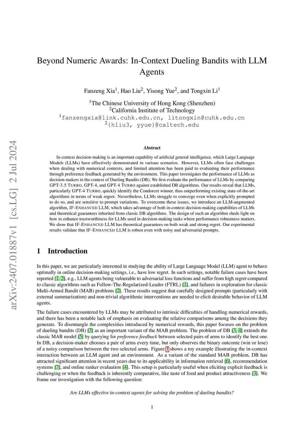 In-Context Reinforcement Learning (ICRL) is a frontier paradigm to solve Reinforcement Learning (RL) problems in the foundation model era. While ICRL capabilities have been demonstrated in transformers through task-specific training, the potential of Large Language Models (LLMs) out-of-the-box remains largely unexplored. This paper investigates whether LLMs can generalize cross-domain to perform ICRL under the problem of Dueling Bandits (DB), a stateless preference-based RL setting. We find that the top-performing LLMs exhibit a notable zero-shot capacity for relative decision-making, which translates to low short-term weak regret across all DB environment instances by quickly including the best arm in duels. However, an optimality gap still exists between LLMs and classic DB algorithms in terms of strong regret. LLMs struggle to converge and consistently exploit even when explicitly prompted to do so, and are sensitive to prompt variations. To bridge this gap, we propose an agentic flow framework: LLM with Enhanced Algorithmic Dueling (LEAD), which integrates off-the-shelf DB algorithm support with LLM agents through fine-grained adaptive interplay. We show that LEAD has theoretical guarantees inherited from classic DB algorithms on both weak and strong regret. We validate its efficacy and robustness even with noisy and adversarial prompts. The design of such an agentic framework sheds light on how to enhance the trustworthiness of general-purpose LLMs generalized to in-context decision-making tasks.