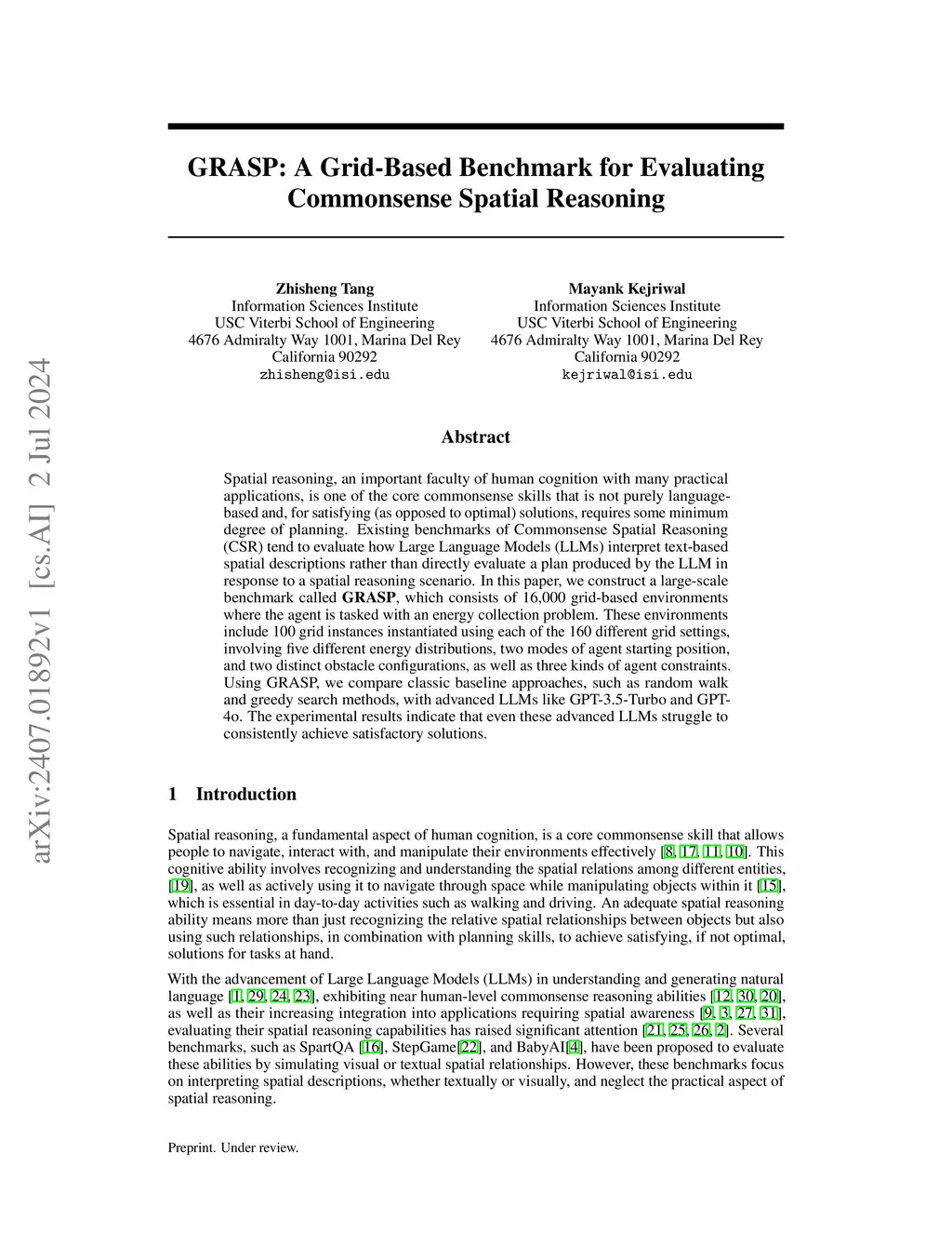 Spatial reasoning, an important faculty of human cognition with many practical applications, is one of the core commonsense skills that is not purely language-based and, for satisfying (as opposed to optimal) solutions, requires some minimum degree of planning. Existing benchmarks of Commonsense Spatial Reasoning (CSR) tend to evaluate how Large Language Models (LLMs) interpret text-based spatial rather than directly evaluate a plan produced by the LLM in response to a spatial reasoning problem. In this paper, we construct a large-scale benchmark called GRASP, which consists of 16,000 grid-based environments where the agent is tasked with an energy collection problem. These environments include 100 grid instances instantiated using each of the 160 different grid settings, involving five different energy distributions, two modes of agent starting position, and two distinct obstacle configurations, as well as three kinds of agent constraints. Using GRASP, we compare classic baseline approaches, such as random walk and greedy search methods, with advanced LLMs like GPT-3.5-Turbo, GPT-4o, and GPT-o1-mini. The experimental results indicate that even these advanced LLMs struggle to consistently achieve satisfactory solutions.