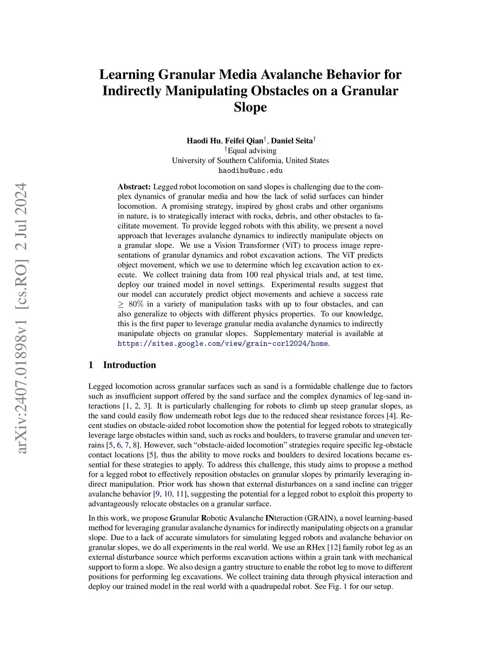 Legged robot locomotion on sand slopes is challenging due to the complex dynamics of granular media and how the lack of solid surfaces can hinder locomotion. A promising strategy, inspired by ghost crabs and other organisms in nature, is to strategically interact with rocks, debris, and other obstacles to facilitate movement. To provide legged robots with this ability, we present a novel approach that leverages avalanche dynamics to indirectly manipulate objects on a granular slope. We use a Vision Transformer (ViT) to process image representations of granular dynamics and robot excavation actions. The ViT predicts object movement, which we use to determine which leg excavation action to execute. We collect training data from 100 real physical trials and, at test time, deploy our trained model in novel settings. Experimental results suggest that our model can accurately predict object movements and achieve a success rate in a variety of manipulation tasks with up to four obstacles, and can also generalize to objects with different physics properties. To our knowledge, this is the first paper to leverage granular media avalanche dynamics to indirectly manipulate objects on granular slopes. Supplementary material is available at https://sites.google.com/view/grain-corl2024/home.