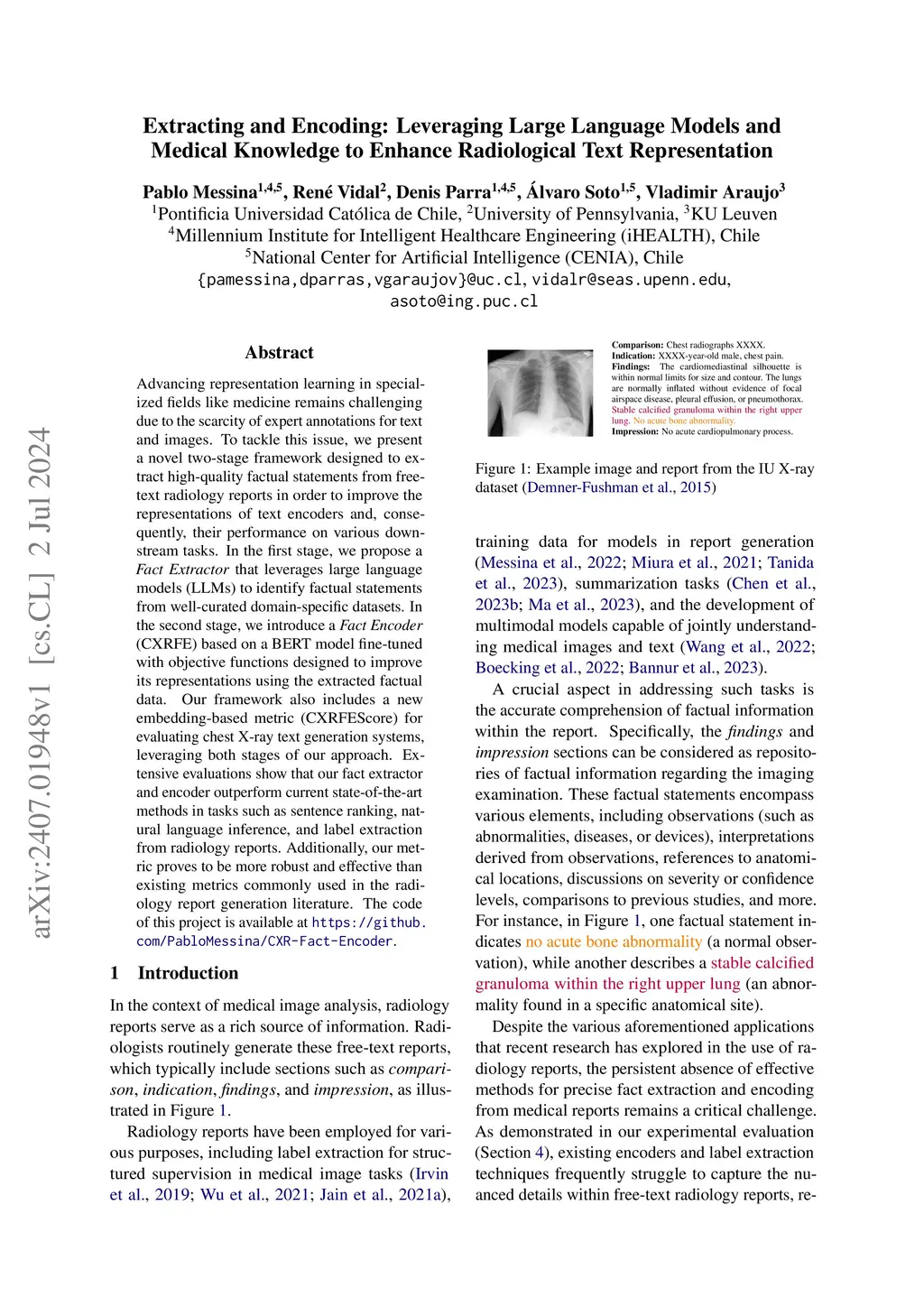 Advancing representation learning in specialized fields like medicine remains challenging due to the scarcity of expert annotations for text and images. To tackle this issue, we present a novel two-stage framework designed to extract high-quality factual statements from free-text radiology reports in order to improve the representations of text encoders and, consequently, their performance on various downstream tasks. In the first stage, we propose a \textit{Fact Extractor} that leverages large language models (LLMs) to identify factual statements from well-curated domain-specific datasets. In the second stage, we introduce a \textit{Fact Encoder} (CXRFE) based on a BERT model fine-tuned with objective functions designed to improve its representations using the extracted factual data. Our framework also includes a new embedding-based metric (CXRFEScore) for evaluating chest X-ray text generation systems, leveraging both stages of our approach. Extensive evaluations show that our fact extractor and encoder outperform current state-of-the-art methods in tasks such as sentence ranking, natural language inference, and label extraction from radiology reports. Additionally, our metric proves to be more robust and effective than existing metrics commonly used in the radiology report generation literature. The code of this project is available at \url{https://github.com/PabloMessina/CXR-Fact-Encoder}.