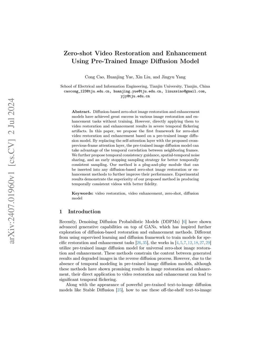 Diffusion-based zero-shot image restoration and enhancement models have achieved great success in various tasks of image restoration and enhancement. However, directly applying them to video restoration and enhancement results in severe temporal flickering artifacts. In this paper, we propose the first framework for zero-shot video restoration and enhancement based on the pre-trained image diffusion model. By replacing the spatial self-attention layer with the proposed short-long-range (SLR) temporal attention layer, the pre-trained image diffusion model can take advantage of the temporal correlation between frames. We further propose temporal consistency guidance, spatial-temporal noise sharing, and an early stopping sampling strategy to improve temporally consistent sampling. Our method is a plug-and-play module that can be inserted into any diffusion-based image restoration or enhancement methods to further improve their performance. Experimental results demonstrate the superiority of our proposed method. Our code is available atthis https URL.
