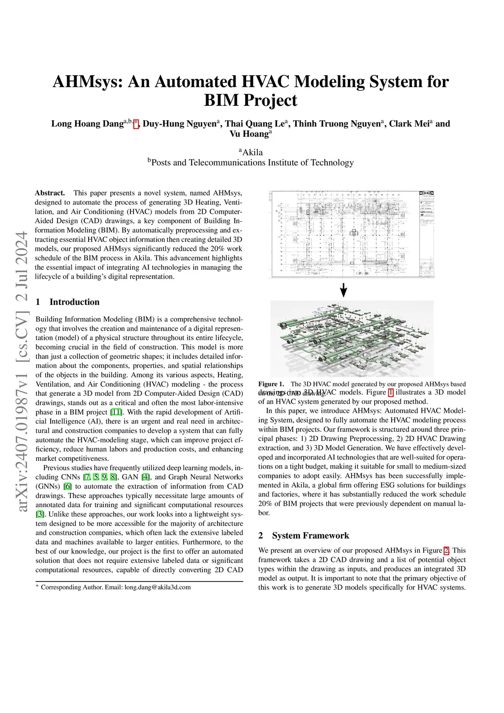 This paper presents a novel system, named AHMsys, designed to automate the process of generating 3D Heating, Ventilation, and Air Conditioning (HVAC) models from 2D Computer-Aided Design (CAD) drawings, a key component of Building Information Modeling (BIM). By automatically preprocessing and extracting essential HVAC object information then creating detailed 3D models, our proposed AHMsys significantly reduced the 20 percent work schedule of the BIM process in Akila. This advancement highlights the essential impact of integrating AI technologies in managing the lifecycle of a digital representation of the building.
