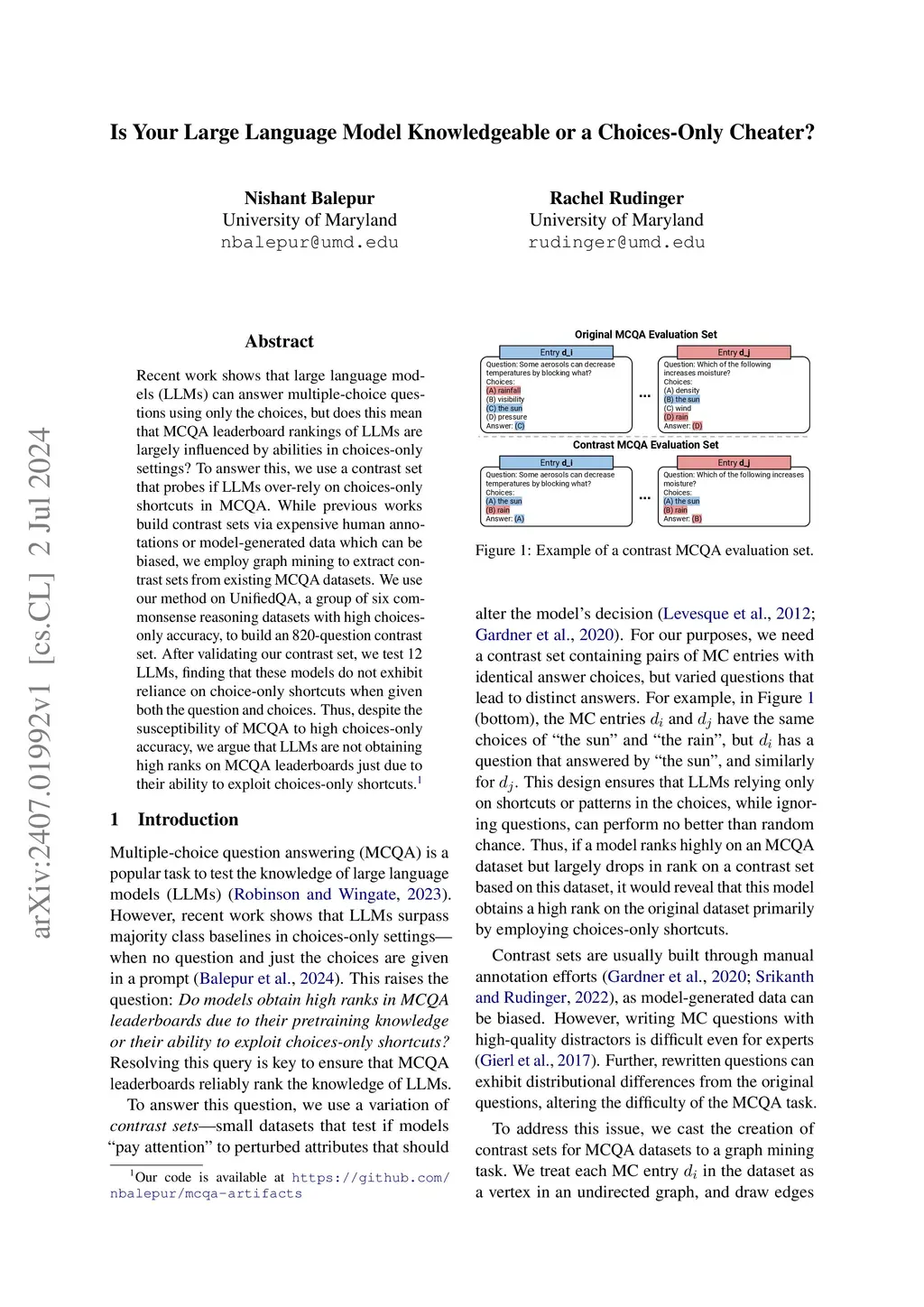 Recent work shows that large language models (LLMs) can answer multiple-choice questions using only the choices, but does this mean that MCQA leaderboard rankings of LLMs are largely influenced by abilities in choices-only settings? To answer this, we use a contrast set that probes if LLMs over-rely on choices-only shortcuts in MCQA. While previous works build contrast sets via expensive human annotations or model-generated data which can be biased, we employ graph mining to extract contrast sets from existing MCQA datasets. We use our method on UnifiedQA, a group of six commonsense reasoning datasets with high choices-only accuracy, to build an 820-question contrast set. After validating our contrast set, we test 12 LLMs, finding that these models do not exhibit reliance on choice-only shortcuts when given both the question and choices. Thus, despite the susceptibility~of MCQA to high choices-only accuracy, we argue that LLMs are not obtaining high ranks on MCQA leaderboards just due to their ability to exploit choices-only shortcuts.