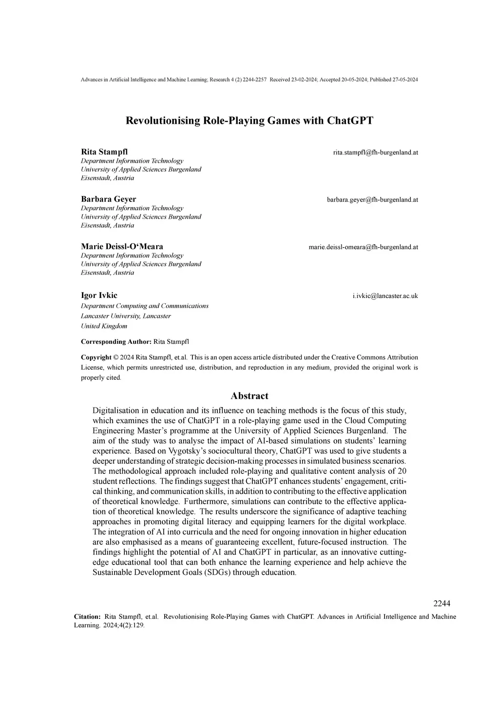 Digitalisation in education and its influence on teaching methods is the focus of this study, which examines the use of ChatGPT in a role-playing game used in the Cloud Computing Engineering Master's programme at the University of Applied Sciences Burgenland. The aim of the study was to analyse the impact of AI-based simulations on students' learning experience. Based on Vygotsky's sociocultural theory, ChatGPT was used to give students a deeper understanding of strategic decision-making processes in simulated business scenarios. The methodological approach included role-playing and qualitative content analysis of 20 student reflections. The findings suggest that ChatGPT enhances students' engagement, critical thinking, and communication skills, in addition to contributing to the effective application of theoretical knowledge. Furthermore, simulations can contribute to the effective application of theoretical knowledge. The results underscore the significance of adaptive teaching approaches in promoting digital literacy and equipping learners for the digital workplace. The integration of AI into curricula and the need for ongoing innovation in higher education are also emphasised as a means of guaranteeing excellent, future-focused instruction. The findings highlight the potential of AI and ChatGPT in particular, as an innovative cutting-edge educational tool that can both enhance the learning experience and help achieve the Sustainable Development Goals (SDGs) through education.