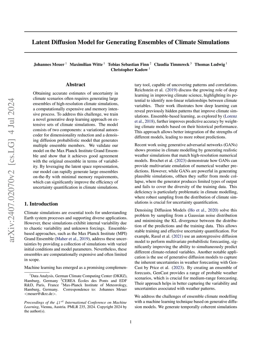 Obtaining accurate estimates of uncertainty in climate scenarios often requires generating large ensembles of high-resolution climate simulations, a computationally expensive and memory intensive process. To address this challenge, we train a novel generative deep learning approach on extensive sets of climate simulations. The model consists of two components: a variational autoencoder for dimensionality reduction and a denoising diffusion probabilistic model that generates multiple ensemble members. We validate our model on the Max Planck Institute Grand Ensemble and show that it achieves good agreement with the original ensemble in terms of variability. By leveraging the latent space representation, our model can rapidly generate large ensembles on-the-fly with minimal memory requirements, which can significantly improve the efficiency of uncertainty quantification in climate simulations.