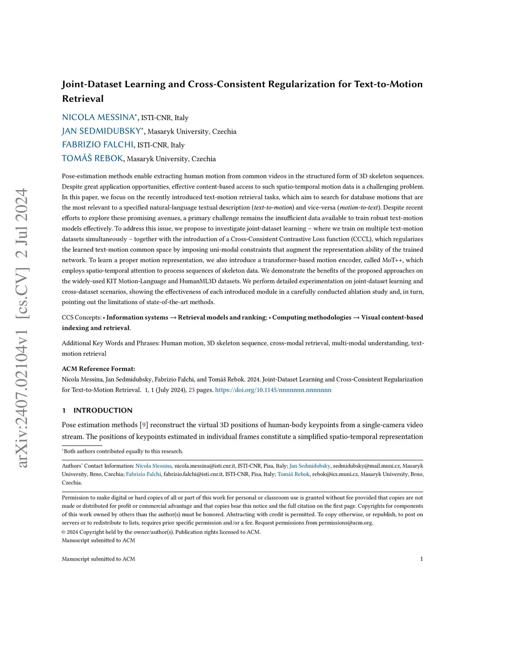 Pose-estimation methods enable extracting human motion from common videos in the structured form of 3D skeleton sequences. Despite great application opportunities, effective content-based access to such spatio-temporal motion data is a challenging problem. In this paper, we focus on the recently introduced text-motion retrieval tasks, which aim to search for database motions that are the most relevant to a specified natural-language textual description (text-to-motion) and vice-versa (motion-to-text). Despite recent efforts to explore these promising avenues, a primary challenge remains the insufficient data available to train robust text-motion models effectively. To address this issue, we propose to investigate joint-dataset learning - where we train on multiple text-motion datasets simultaneously - together with the introduction of a Cross-Consistent Contrastive Loss function (CCCL), which regularizes the learned text-motion common space by imposing uni-modal constraints that augment the representation ability of the trained network. To learn a proper motion representation, we also introduce a transformer-based motion encoder, called MoT++, which employs spatio-temporal attention to process sequences of skeleton data. We demonstrate the benefits of the proposed approaches on the widely-used KIT Motion-Language and HumanML3D datasets. We perform detailed experimentation on joint-dataset learning and cross-dataset scenarios, showing the effectiveness of each introduced module in a carefully conducted ablation study and, in turn, pointing out the limitations of state-of-the-art methods.