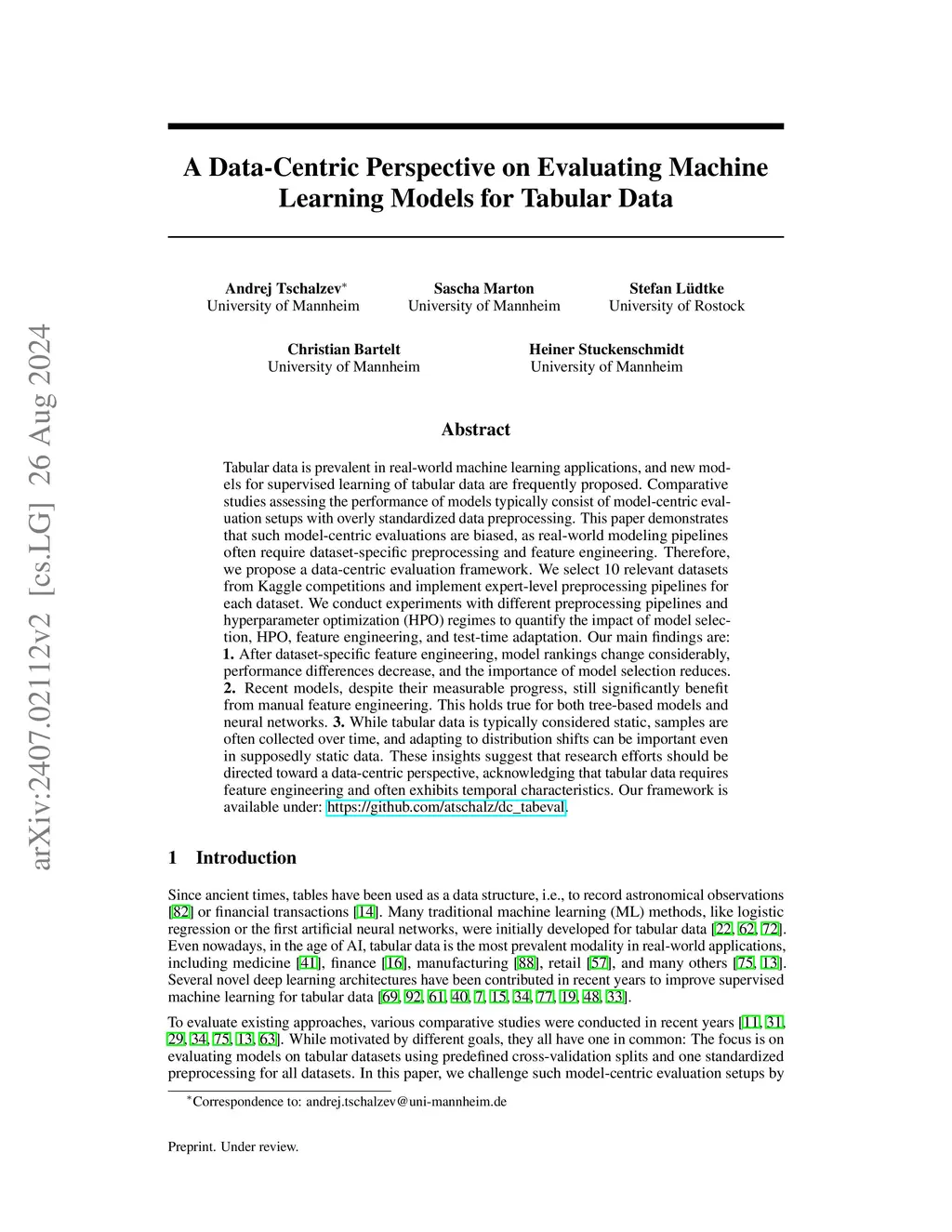 Tabular data is prevalent in real-world machine learning applications, and new models for supervised learning of tabular data are frequently proposed. Comparative studies assessing the performance of models typically consist of model-centric evaluation setups with overly standardized data preprocessing. This paper demonstrates that such model-centric evaluations are biased, as real-world modeling pipelines often require dataset-specific preprocessing and feature engineering. Therefore, we propose a data-centric evaluation framework. We select 10 relevant datasets from Kaggle competitions and implement expert-level preprocessing pipelines for each dataset. We conduct experiments with different preprocessing pipelines and hyperparameter optimization (HPO) regimes to quantify the impact of model selection, HPO, feature engineering, and test-time adaptation. Our main findings are: 1. After dataset-specific feature engineering, model rankings change considerably, performance differences decrease, and the importance of model selection reduces. 2. Recent models, despite their measurable progress, still significantly benefit from manual feature engineering. This holds true for both tree-based models and neural networks. 3. While tabular data is typically considered static, samples are often collected over time, and adapting to distribution shifts can be important even in supposedly static data. These insights suggest that research efforts should be directed toward a data-centric perspective, acknowledging that tabular data requires feature engineering and often exhibits temporal characteristics. Our framework is available under: https://github.com/atschalz/dc_tabeval.
