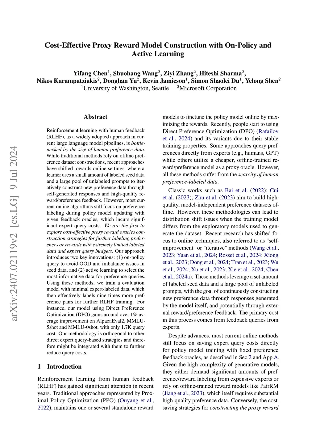 Reinforcement learning with human feedback (RLHF), as a widely adopted approach in current large language model pipelines, is \textit{bottlenecked by the size of human preference data}. While traditional methods rely on offline preference dataset constructions, recent approaches have shifted towards online settings, where a learner uses a small amount of labeled seed data and a large pool of unlabeled prompts to iteratively construct new preference data through self-generated responses and high-quality reward/preference feedback. However, most current online algorithms still focus on preference labeling during policy model updating with given feedback oracles, which incurs significant expert query costs. \textit{We are the first to explore cost-effective proxy reward oracles construction strategies for further labeling preferences or rewards with extremely limited labeled data and expert query budgets}. Our approach introduces two key innovations: (1) on-policy query to avoid OOD and imbalance issues in seed data, and (2) active learning to select the most informative data for preference queries. Using these methods, we train a evaluation model with minimal expert-labeled data, which then effectively labels nine times more preference pairs for further RLHF training. For instance, our model using Direct Preference Optimization (DPO) gains around over 1% average improvement on AlpacaEval2, MMLU-5shot and MMLU-0shot, with only 1.7K query cost. Our methodology is orthogonal to other direct expert query-based strategies and therefore might be integrated with them to further reduce query costs.
