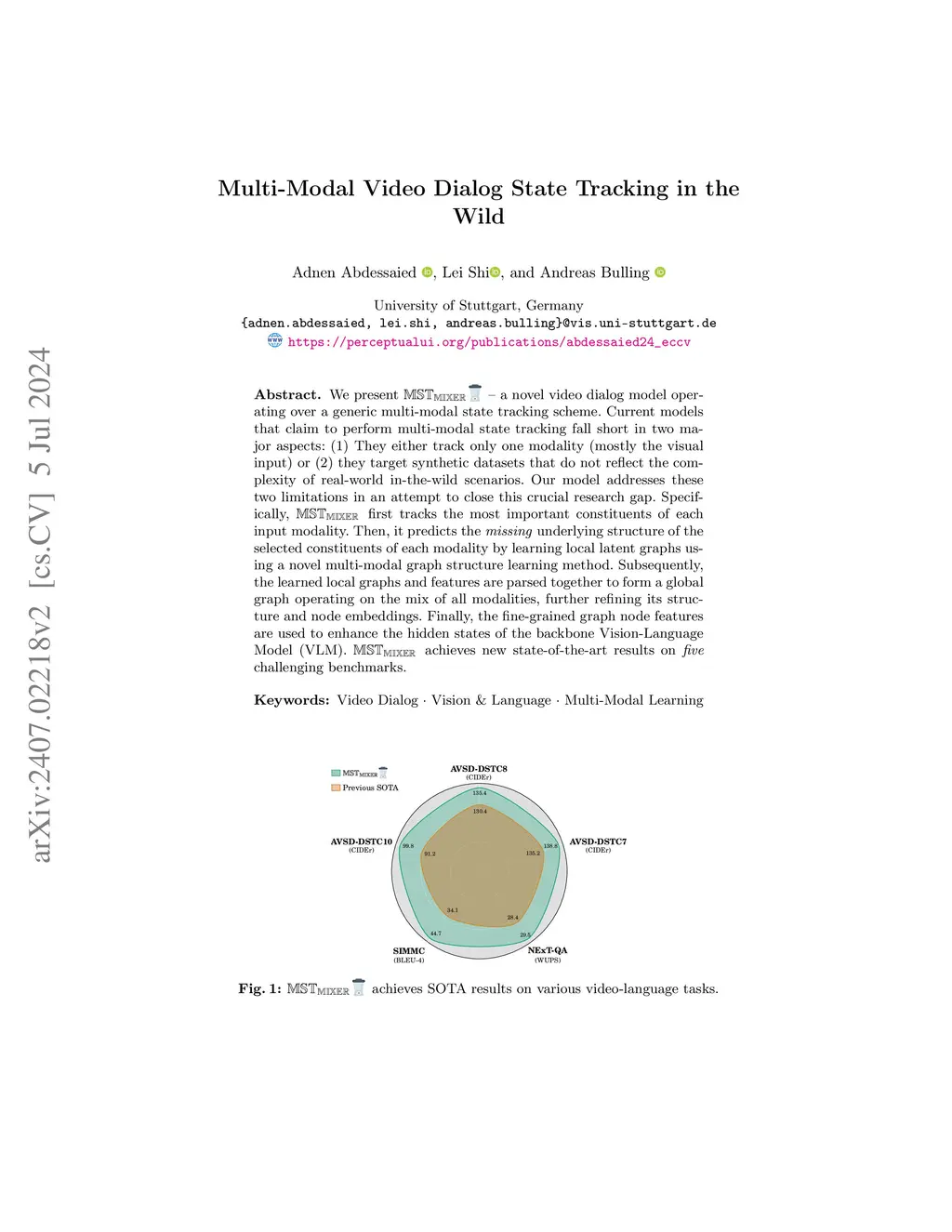 We present MST-MIXER - a novel video dialog model operating over a generic multi-modal state tracking scheme. Current models that claim to perform multi-modal state tracking fall short of two major aspects: (1) They either track only one modality (mostly the visual input) or (2) they target synthetic datasets that do not reflect the complexity of real-world in the wild scenarios. Our model addresses these two limitations in an attempt to close this crucial research gap. Specifically, MST-MIXER first tracks the most important constituents of each input modality. Then, it predicts the missing underlying structure of the selected constituents of each modality by learning local latent graphs using a novel multi-modal graph structure learning method. Subsequently, the learned local graphs and features are parsed together to form a global graph operating on the mix of all modalities which further refines its structure and node embeddings. Finally, the fine-grained graph node features are used to enhance the hidden states of the backbone Vision-Language Model (VLM). MST-MIXER achieves new state-of-the-art results on five challenging benchmarks.