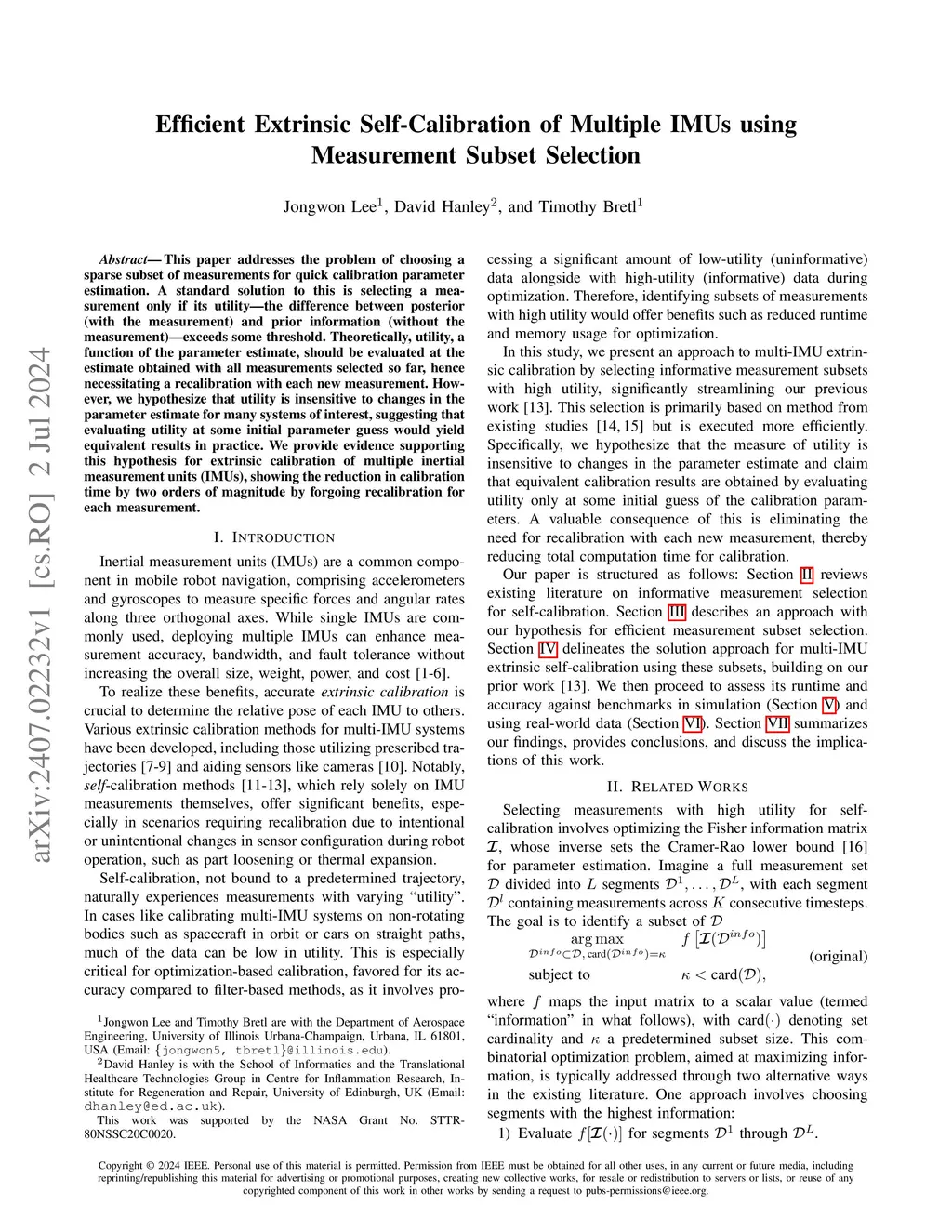 This paper addresses the problem of choosing a sparse subset of measurements for quick calibration parameter estimation. A standard solution to this is selecting a measurement only if its utility -- the difference between posterior (with the measurement) and prior information (without the measurement) -- exceeds some threshold. Theoretically, utility, a function of the parameter estimate, should be evaluated at the estimate obtained with all measurements selected so far, hence necessitating a recalibration with each new measurement. However, we hypothesize that utility is insensitive to changes in the parameter estimate for many systems of interest, suggesting that evaluating utility at some initial parameter guess would yield equivalent results in practice. We provide evidence supporting this hypothesis for extrinsic calibration of multiple inertial measurement units (IMUs), showing the reduction in calibration time by two orders of magnitude by forgoing recalibration for each measurement.
