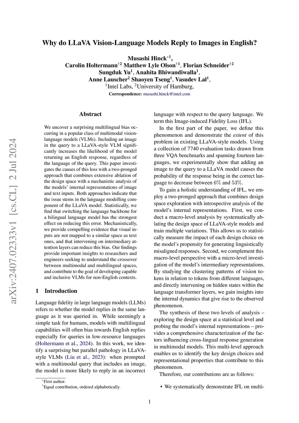 Why do LLaVA Vision-Language Models Reply to Images in English?