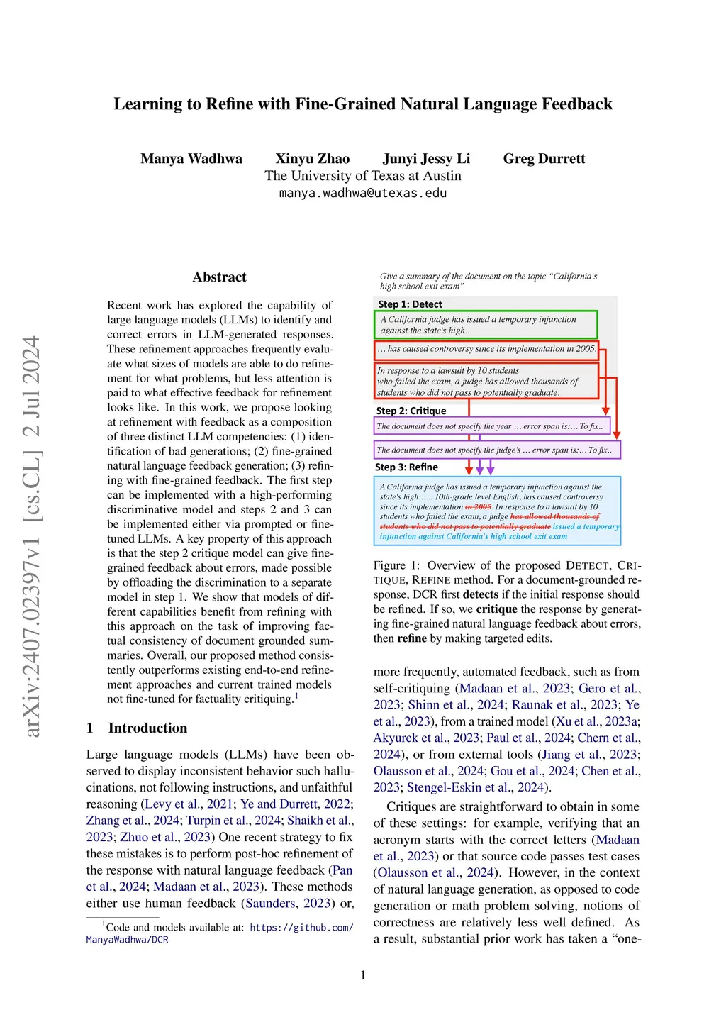 Recent work has explored the capability of large language models (LLMs) to identify and correct errors in LLM-generated responses. These refinement approaches frequently evaluate what sizes of models are able to do refinement for what problems, but less attention is paid to what effective feedback for refinement looks like. In this work, we propose looking at refinement with feedback as a composition of three distinct LLM competencies: (1) detection of bad generations; (2) fine-grained natural language critique generation; (3) refining with fine-grained feedback. The first step can be implemented with a high-performing discriminative model and steps 2 and 3 can be implemented either via prompted or fine-tuned LLMs. A key property of the proposed Detect, Critique, Refine ("DCR") method is that the step 2 critique model can give fine-grained feedback about errors, made possible by offloading the discrimination to a separate model in step 1. We show that models of different capabilities benefit from refining with DCR on the task of improving factual consistency of document grounded summaries. Overall, DCR consistently outperforms existing end-to-end refinement approaches and current trained models not fine-tuned for factuality critiquing.