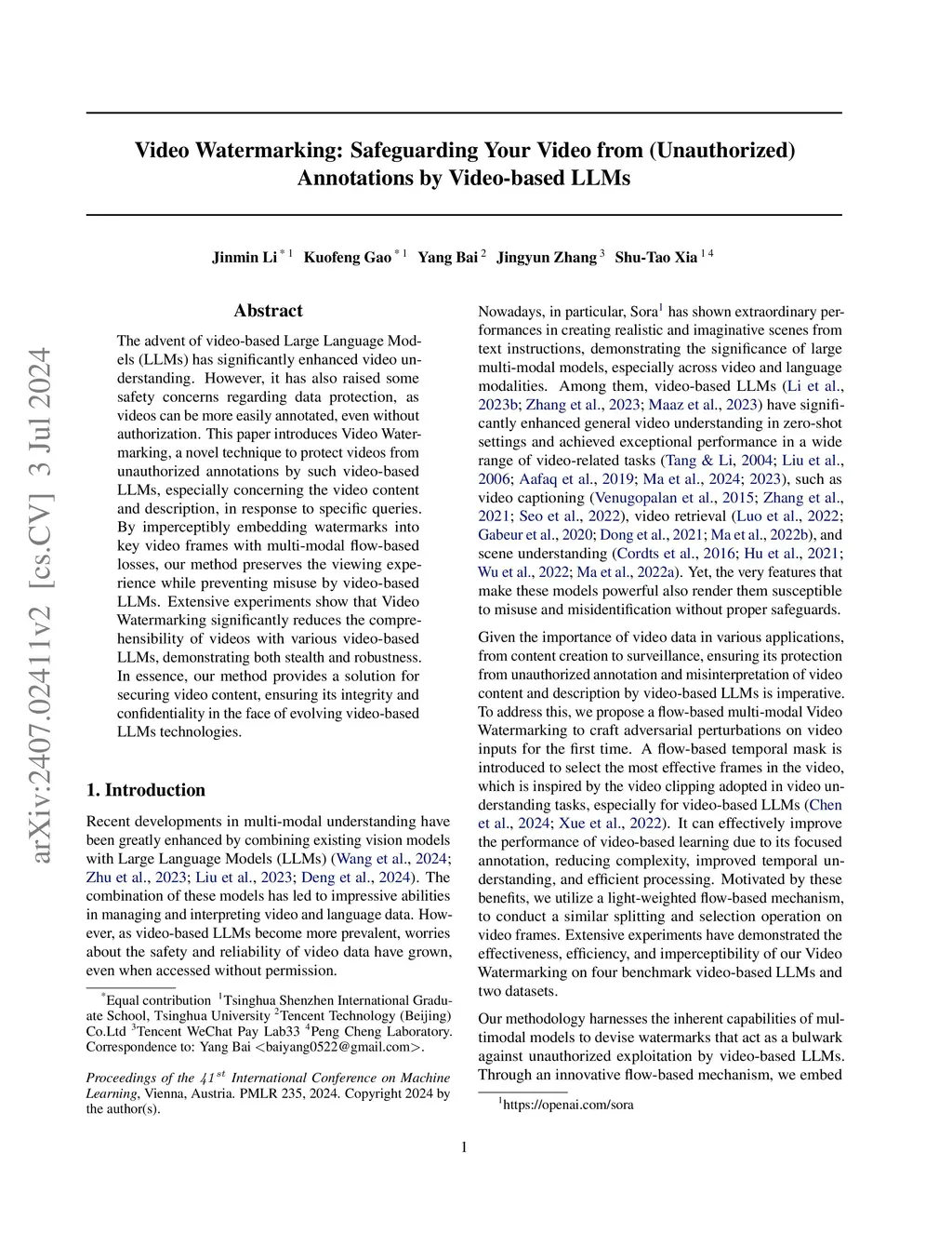 The advent of video-based Large Language Models (LLMs) has significantly enhanced video understanding. However, it has also raised some safety concerns regarding data protection, as videos can be more easily annotated, even without authorization. This paper introduces Video Watermarking, a novel technique to protect videos from unauthorized annotations by such video-based LLMs, especially concerning the video content and description, in response to specific queries. By imperceptibly embedding watermarks into key video frames with multi-modal flow-based losses, our method preserves the viewing experience while preventing misuse by video-based LLMs. Extensive experiments show that Video Watermarking significantly reduces the comprehensibility of videos with various video-based LLMs, demonstrating both stealth and robustness. In essence, our method provides a solution for securing video content, ensuring its integrity and confidentiality in the face of evolving video-based LLMs technologies.
