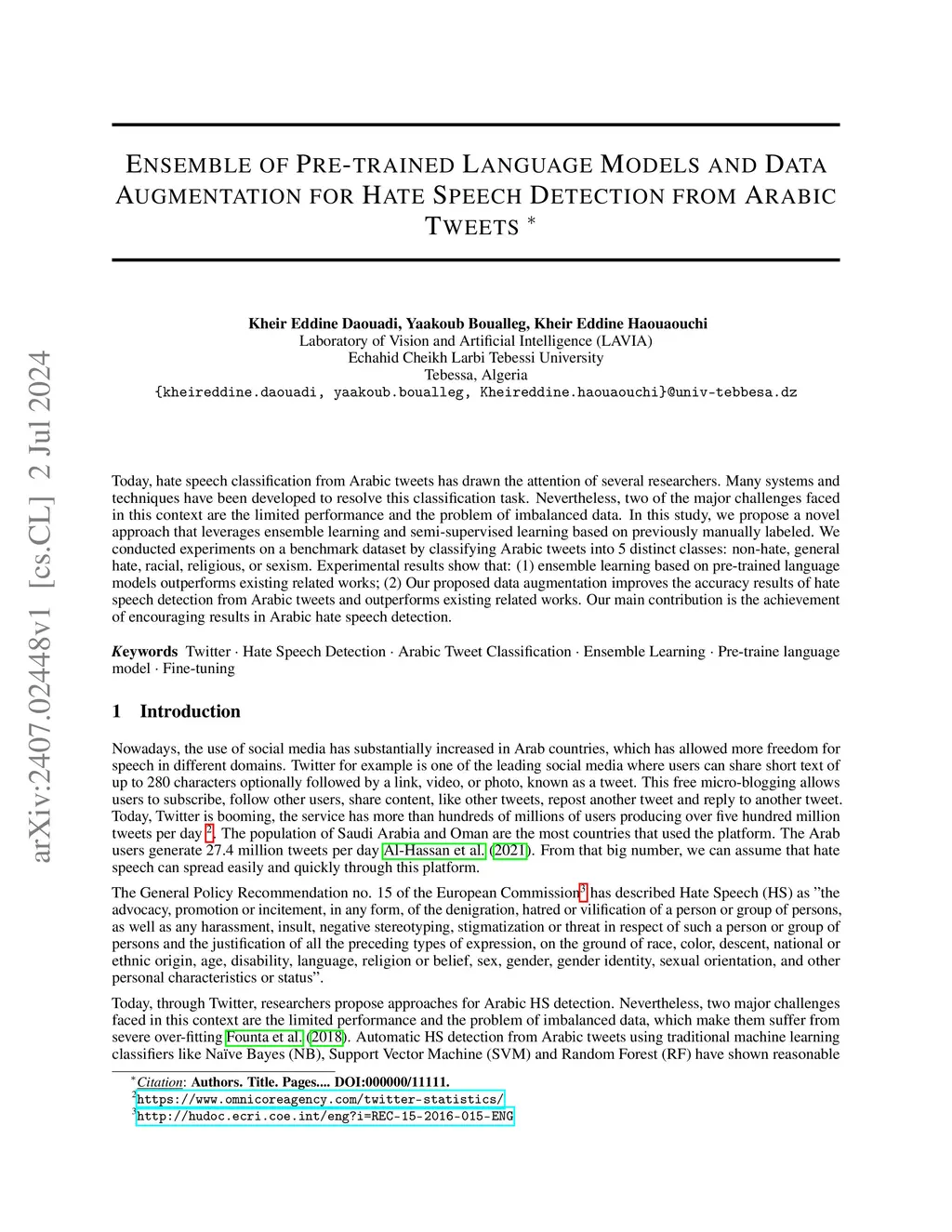 Today, hate speech classification from Arabic tweets has drawn the attention of several researchers. Many systems and techniques have been developed to resolve this classification task. Nevertheless, two of the major challenges faced in this context are the limited performance and the problem of imbalanced data. In this study, we propose a novel approach that leverages ensemble learning and semi-supervised learning based on previously manually labeled. We conducted experiments on a benchmark dataset by classifying Arabic tweets into 5 distinct classes: non-hate, general hate, racial, religious, or sexism. Experimental results show that: (1) ensemble learning based on pre-trained language models outperforms existing related works; (2) Our proposed data augmentation improves the accuracy results of hate speech detection from Arabic tweets and outperforms existing related works. Our main contribution is the achievement of encouraging results in Arabic hate speech detection.