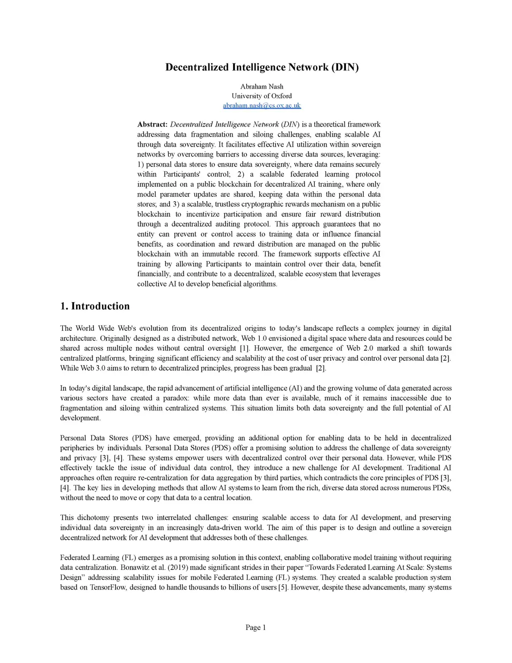 Decentralized Intelligence Network (DIN) is a theoretical framework addressing data fragmentation and siloing challenges, enabling scalable AI through data sovereignty. It facilitates effective AI utilization within sovereign networks by overcoming barriers to accessing diverse data sources, leveraging: 1) personal data stores to ensure data sovereignty, where data remains securely within Participants' control; 2) a scalable federated learning protocol implemented on a public blockchain for decentralized AI training, where only model parameter updates are shared, keeping data within the personal data stores; and 3) a scalable, trustless cryptographic rewards mechanism on a public blockchain to incentivize participation and ensure fair reward distribution through a decentralized auditing protocol. This approach guarantees that no entity can prevent or control access to training data or influence financial benefits, as coordination and reward distribution are managed on the public blockchain with an immutable record. The framework supports effective AI training by allowing Participants to maintain control over their data, benefit financially, and contribute to a decentralized, scalable ecosystem that leverages collective AI to develop beneficial algorithms.