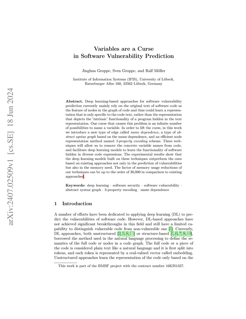 Deep learning-based approaches for software vulnerability prediction currently mainly rely on the original text of software code as the feature of nodes in the graph of code and thus could learn a representation that is only specific to the code text, rather than the representation that depicts the íntrinsic' functionality of a program hidden in the text representation. One curse that causes this problem is an infinite number of possibilities to name a variable. In order to lift the curse, in this work we introduce a new type of edge called name dependence, a type of abstract syntax graph based on the name dependence, and an efficient node representation method named 3-property encoding scheme. These techniques will allow us to remove the concrete variable names from code, and facilitate deep learning models to learn the functionality of software hidden in diverse code expressions. The experimental results show that the deep learning models built on these techniques outperform the ones based on existing approaches not only in the prediction of vulnerabilities but also in the memory need. The factor of memory usage reductions of our techniques can be up to the order of 30,000 in comparison to existing approaches.