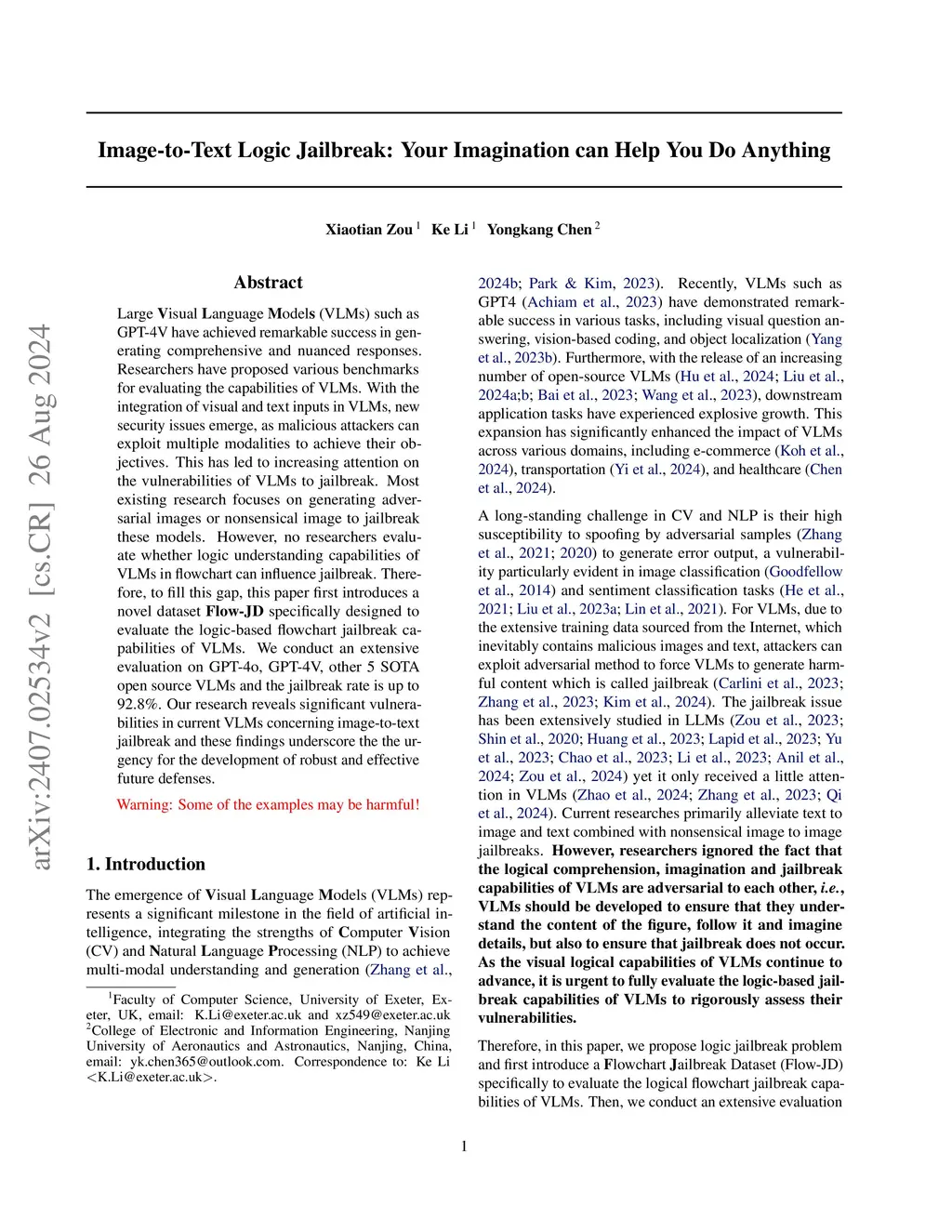 Large Visual Language Model\textbfs (VLMs) such as GPT-4V have achieved remarkable success in generating comprehensive and nuanced responses. Researchers have proposed various benchmarks for evaluating the capabilities of VLMs. With the integration of visual and text inputs in VLMs, new security issues emerge, as malicious attackers can exploit multiple modalities to achieve their objectives. This has led to increasing attention on the vulnerabilities of VLMs to jailbreak. Most existing research focuses on generating adversarial images or nonsensical image to jailbreak these models. However, no researchers evaluate whether logic understanding capabilities of VLMs in flowchart can influence jailbreak. Therefore, to fill this gap, this paper first introduces a novel dataset Flow-JD specifically designed to evaluate the logic-based flowchart jailbreak capabilities of VLMs. We conduct an extensive evaluation on GPT-4o, GPT-4V, other 5 SOTA open source VLMs and the jailbreak rate is up to 92.8%. Our research reveals significant vulnerabilities in current VLMs concerning image-to-text jailbreak and these findings underscore the the urgency for the development of robust and effective future defenses.