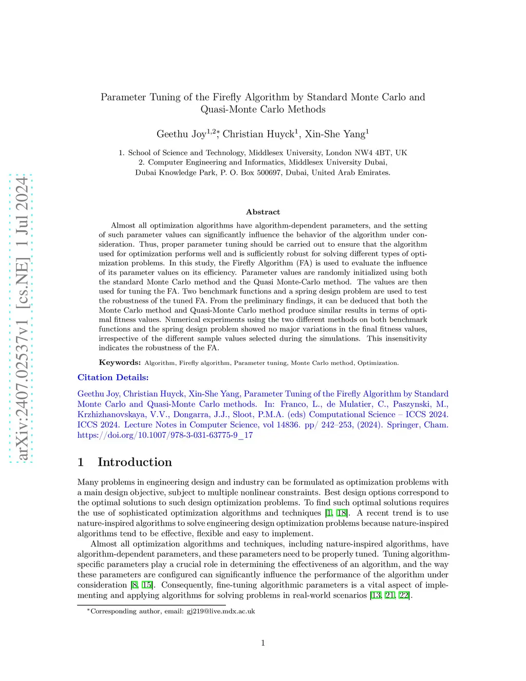 Parameter Tuning of the Firefly Algorithm by Standard Monte Carlo and