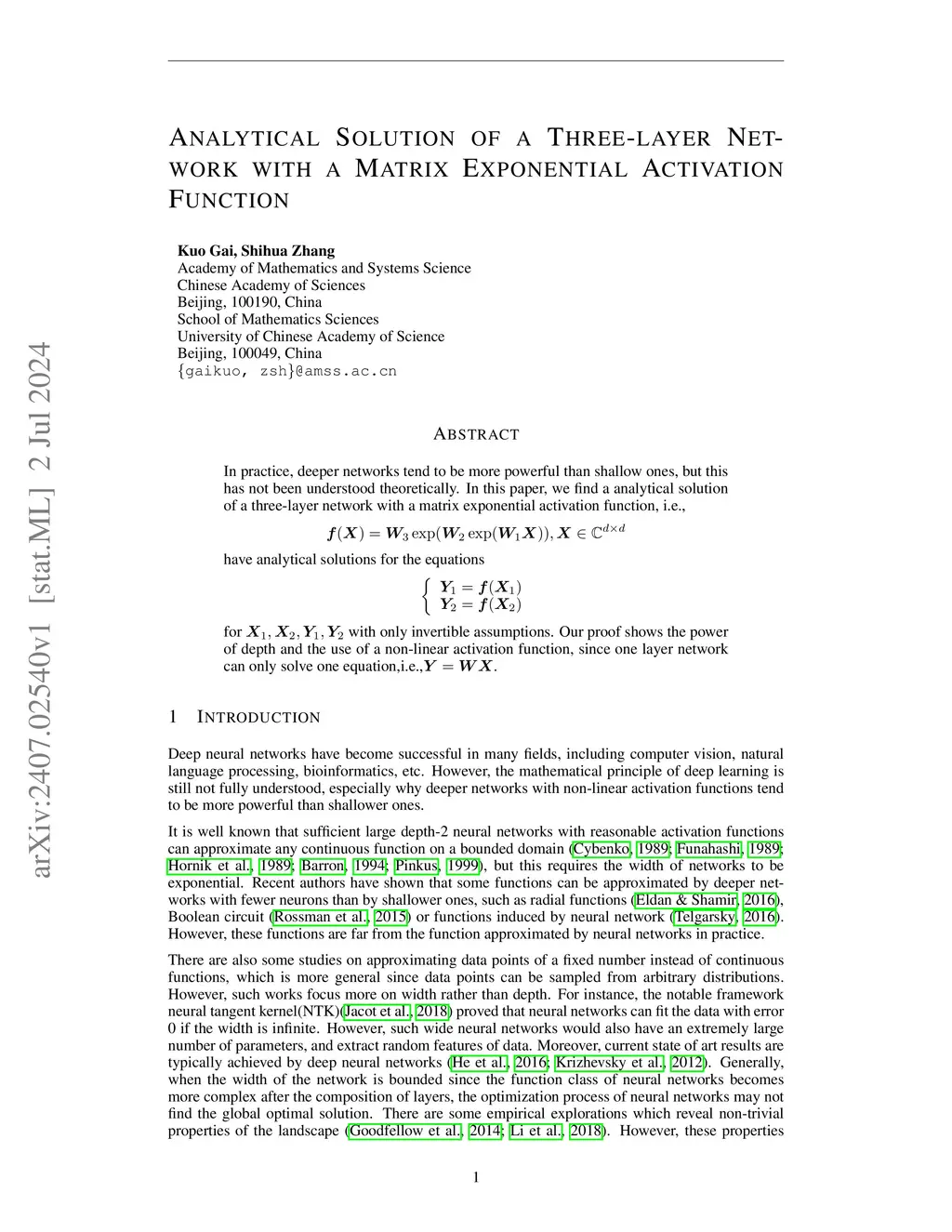 In practice, deeper networks tend to be more powerful than shallow ones, but this has not been understood theoretically. In this paper, we find the analytical solution of a three-layer network with a matrix exponential activation function, i.e., have analytical solutions for the equations for with only invertible assumptions. Our proof shows the power of depth and the use of a non-linear activation function, since one layer network can only solve one equation,i.e.,.