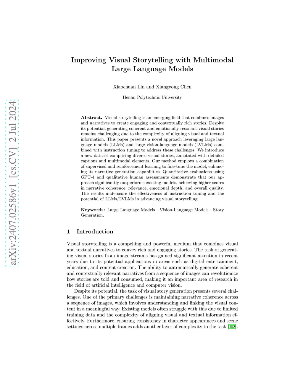 Visual storytelling is an emerging field that combines images and narratives to create engaging and contextually rich stories. Despite its potential, generating coherent and emotionally resonant visual stories remains challenging due to the complexity of aligning visual and textual information. This paper presents a novel approach leveraging large language models (LLMs) and large vision-language models (LVLMs) combined with instruction tuning to address these challenges. We introduce a new dataset comprising diverse visual stories, annotated with detailed captions and multimodal elements. Our method employs a combination of supervised and reinforcement learning to fine-tune the model, enhancing its narrative generation capabilities. Quantitative evaluations using GPT-4 and qualitative human assessments demonstrate that our approach significantly outperforms existing models, achieving higher scores in narrative coherence, relevance, emotional depth, and overall quality. The results underscore the effectiveness of instruction tuning and the potential of LLMs/LVLMs in advancing visual storytelling.