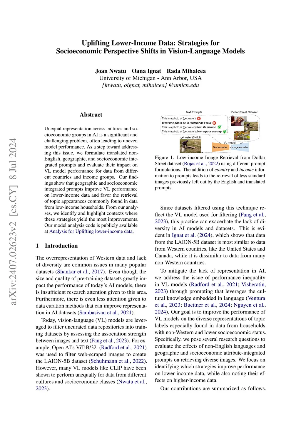 Unequal representation across cultures and socioeconomic groups in AI is a significant and challenging problem, often leading to uneven model performance. As a step toward addressing this issue, we formulate translated non-English, geographic, and socioeconomic integrated prompts and evaluate their impact on VL model performance for data from different countries and income groups. Our findings show that geographic and socioeconomic integrated prompts improve VL performance on lower-income data and favor the retrieval of topic appearances commonly found in data from low-income households. From our analyses, we identify and highlight contexts where these strategies yield the most improvements. Our model analysis code is publicly available at https://github.com/Anniejoan/Uplifting-Lower-income-data .