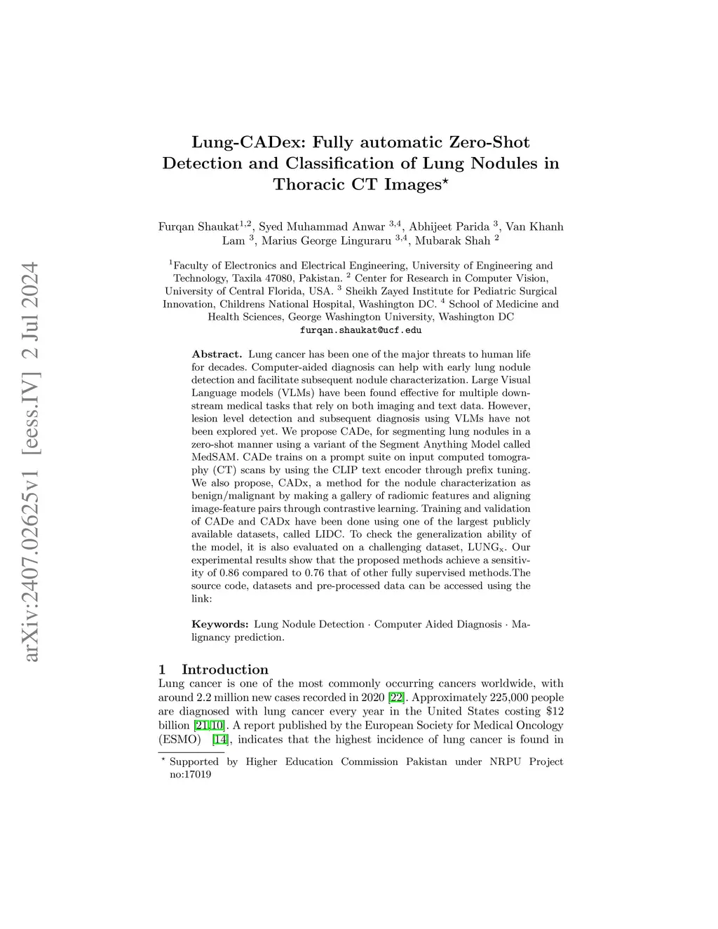 Lung cancer has been one of the major threats to human life for decades. Computer-aided diagnosis can help with early lung nodul detection and facilitate subsequent nodule characterization. Large Visual Language models (VLMs) have been found effective for multiple downstream medical tasks that rely on both imaging and text data. However, lesion level detection and subsequent diagnosis using VLMs have not been explored yet. We propose CADe, for segmenting lung nodules in a zero-shot manner using a variant of the Segment Anything Model called MedSAM. CADe trains on a prompt suite on input computed tomography (CT) scans by using the CLIP text encoder through prefix tuning. We also propose, CADx, a method for the nodule characterization as benign/malignant by making a gallery of radiomic features and aligning image-feature pairs through contrastive learning. Training and validation of CADe and CADx have been done using one of the largest publicly available datasets, called LIDC. To check the generalization ability of the model, it is also evaluated on a challenging dataset, LUNGx. Our experimental results show that the proposed methods achieve a sensitivity of 0.86 compared to 0.76 that of other fully supervised methods.The source code, datasets and pre-processed data can be accessed using the link: