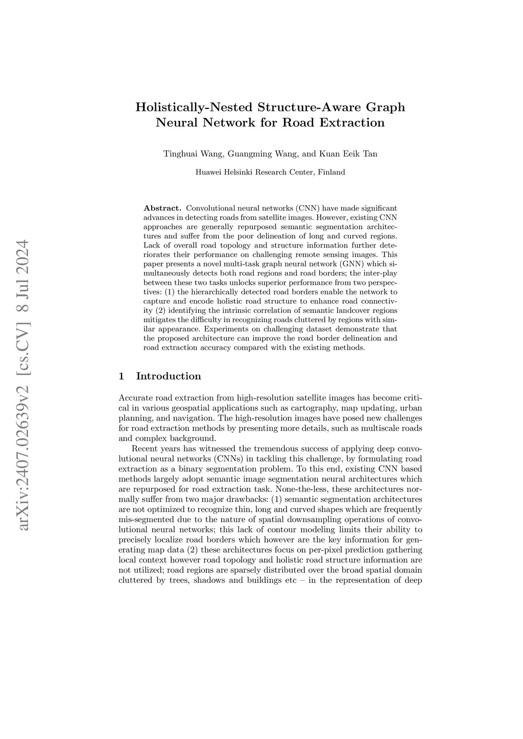 Convolutional neural networks (CNN) have made significant advances in detecting roads from satellite images. However, existing CNN approaches are generally repurposed semantic segmentation architectures and suffer from the poor delineation of long and curved regions. Lack of overall road topology and structure information further deteriorates their performance on challenging remote sensing images. This paper presents a novel multi-task graph neural network (GNN) which simultaneously detects both road regions and road borders; the inter-play between these two tasks unlocks superior performance from two perspectives: (1) the hierarchically detected road borders enable the network to capture and encode holistic road structure to enhance road connectivity (2) identifying the intrinsic correlation of semantic landcover regions mitigates the difficulty in recognizing roads cluttered by regions with similar appearance. Experiments on challenging dataset demonstrate that the proposed architecture can improve the road border delineation and road extraction accuracy compared with the existing methods.