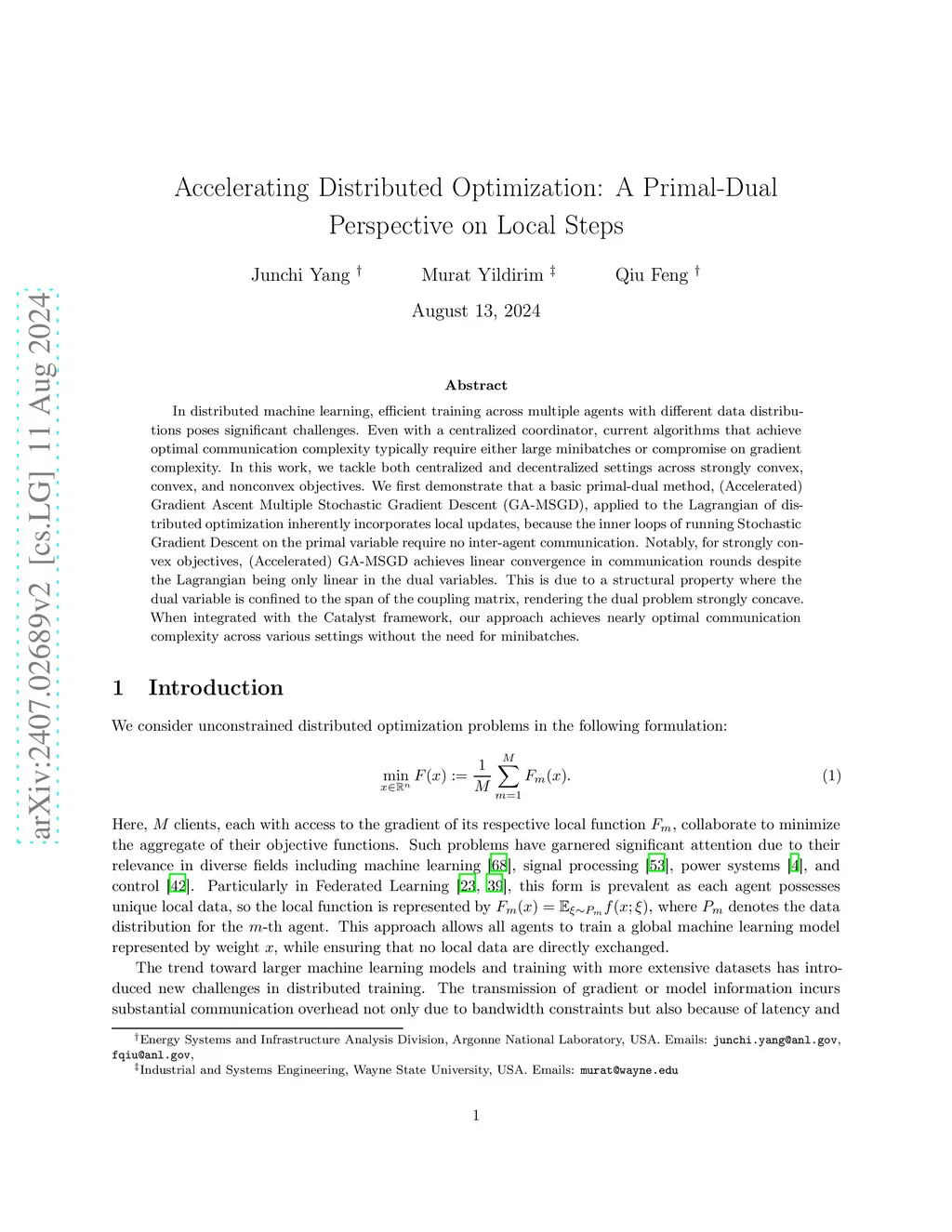 In distributed machine learning, efficient training across multiple agents with different data distributions poses significant challenges. Even with a centralized coordinator, current algorithms that achieve optimal communication complexity typically require either large minibatches or compromise on gradient complexity. In this work, we tackle both centralized and decentralized settings across strongly convex, convex, and nonconvex objectives. We first demonstrate that a basic primal-dual method, (Accelerated) Gradient Ascent Multiple Stochastic Gradient Descent (GA-MSGD), applied to the Lagrangian of distributed optimization inherently incorporates local updates, because the inner loops of running Stochastic Gradient Descent on the primal variable require no inter-agent communication. Notably, for strongly convex objectives, (Accelerated) GA-MSGD achieves linear convergence in communication rounds despite the Lagrangian being only linear in the dual variables. This is due to a structural property where the dual variable is confined to the span of the coupling matrix, rendering the dual problem strongly concave. When integrated with the Catalyst framework, our approach achieves nearly optimal communication complexity across various settings without the need for minibatches.