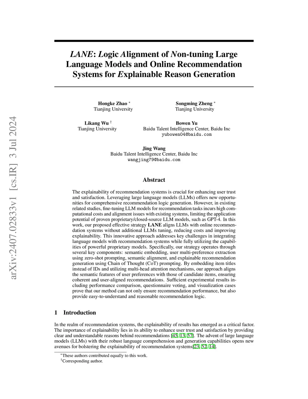 The explainability of recommendation systems is crucial for enhancing user trust and satisfaction. Leveraging large language models (LLMs) offers new opportunities for comprehensive recommendation logic generation. However, in existing related studies, fine-tuning LLM models for recommendation tasks incurs high computational costs and alignment issues with existing systems, limiting the application potential of proven proprietary/closed-source LLM models, such as GPT-4. In this work, our proposed effective strategy LANE aligns LLMs with online recommendation systems without additional LLMs tuning, reducing costs and improving explainability. This innovative approach addresses key challenges in integrating language models with recommendation systems while fully utilizing the capabilities of powerful proprietary models. Specifically, our strategy operates through several key components: semantic embedding, user multi-preference extraction using zero-shot prompting, semantic alignment, and explainable recommendation generation using Chain of Thought (CoT) prompting. By embedding item titles instead of IDs and utilizing multi-head attention mechanisms, our approach aligns the semantic features of user preferences with those of candidate items, ensuring coherent and user-aligned recommendations. Sufficient experimental results including performance comparison, questionnaire voting, and visualization cases prove that our method can not only ensure recommendation performance, but also provide easy-to-understand and reasonable recommendation logic.