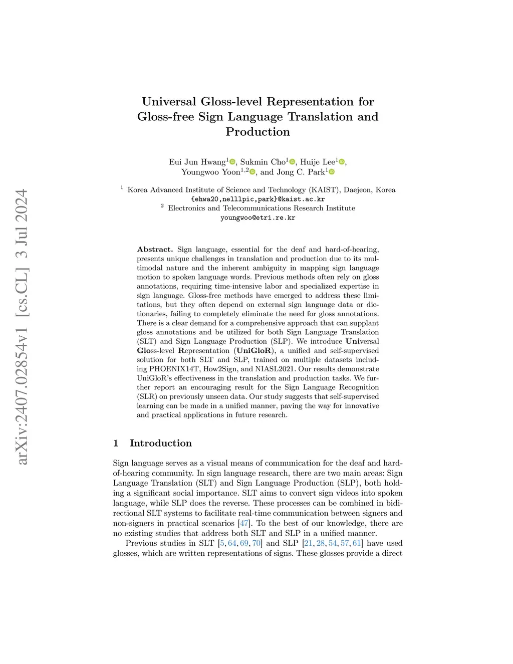 Sign language, essential for the deaf and hard-of-hearing, presents unique challenges in translation and production due to its multimodal nature and the inherent ambiguity in mapping sign language motion to spoken language words. Previous methods often rely on gloss annotations, requiring time-intensive labor and specialized expertise in sign language. Gloss-free methods have emerged to address these limitations, but they often depend on external sign language data or dictionaries, failing to completely eliminate the need for gloss annotations. There is a clear demand for a comprehensive approach that can supplant gloss annotations and be utilized for both Sign Language Translation (SLT) and Sign Language Production (SLP). We introduce Universal Gloss-level Representation (UniGloR), a unified and self-supervised solution for both SLT and SLP, trained on multiple datasets including PHOENIX14T, How2Sign, and NIASL2021. Our results demonstrate UniGloR's effectiveness in the translation and production tasks. We further report an encouraging result for the Sign Language Recognition (SLR) on previously unseen data. Our study suggests that self-supervised learning can be made in a unified manner, paving the way for innovative and practical applications in future research.