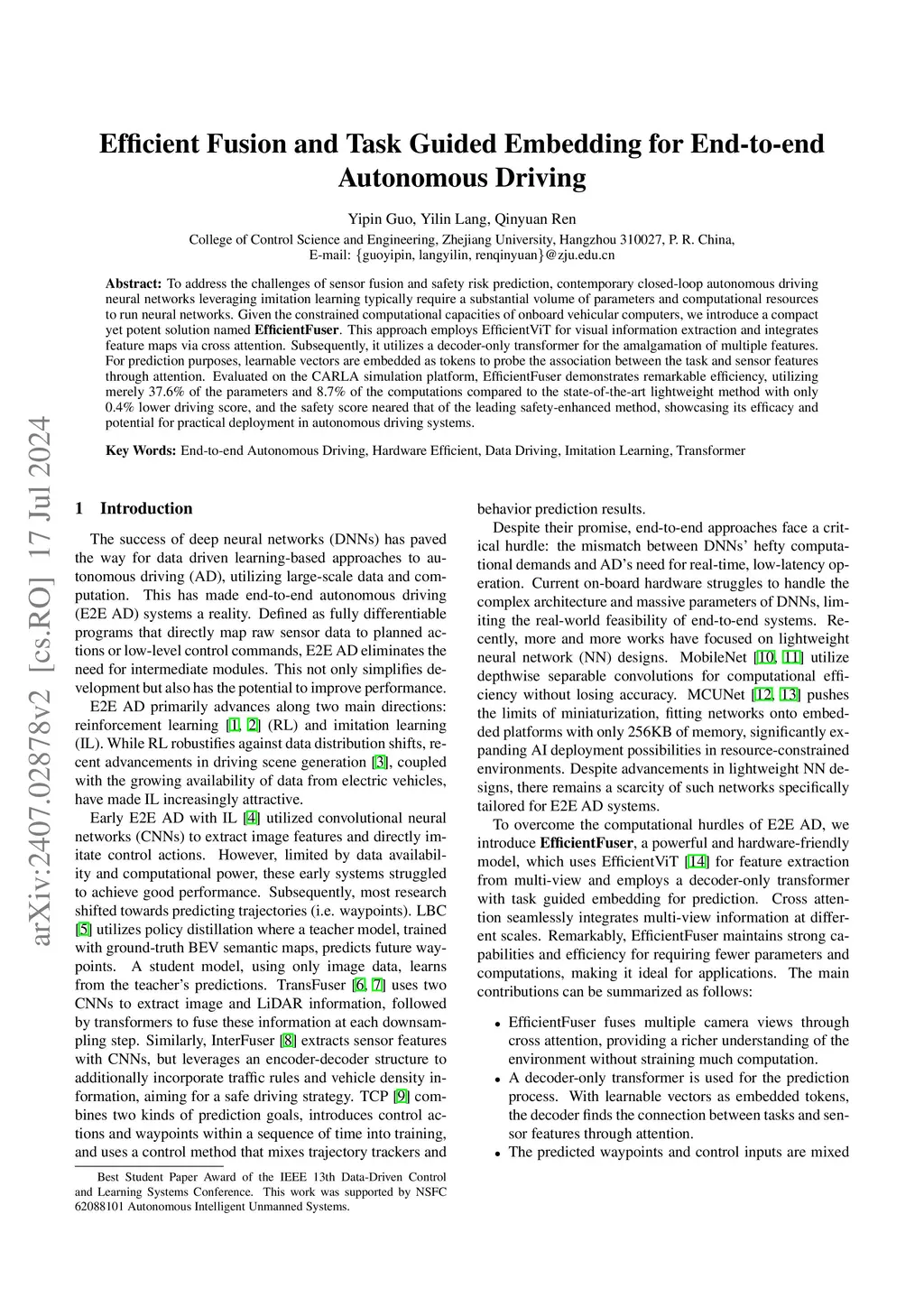 To address the challenges of sensor fusion and safety risk prediction, contemporary closed-loop autonomous driving neural networks leveraging imitation learning typically require a substantial volume of parameters and computational resources to run neural networks. Given the constrained computational capacities of onboard vehicular computers, we introduce a compact yet potent solution named EfficientFuser. This approach employs EfficientViT for visual information extraction and integrates feature maps via cross attention. Subsequently, it utilizes a decoder-only transformer for the amalgamation of multiple features. For prediction purposes, learnable vectors are embedded as tokens to probe the association between the task and sensor features through attention. Evaluated on the CARLA simulation platform, EfficientFuser demonstrates remarkable efficiency, utilizing merely 37.6% of the parameters and 8.7% of the computations compared to the state-of-the-art lightweight method with only 0.4% lower driving score, and the safety score neared that of the leading safety-enhanced method, showcasing its efficacy and potential for practical deployment in autonomous driving systems.