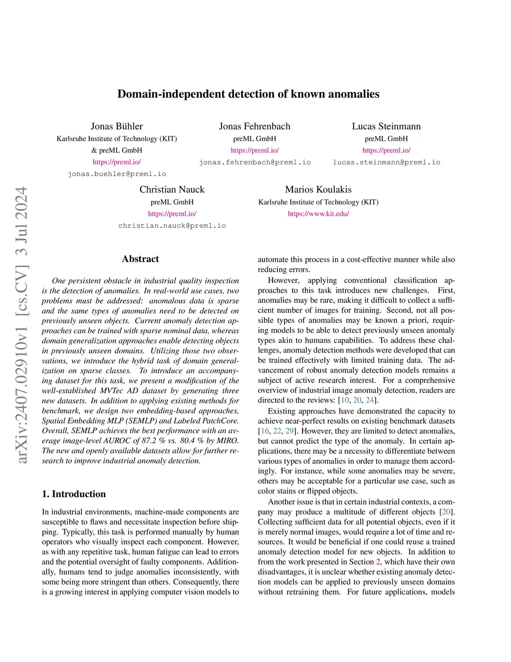 One persistent obstacle in industrial quality inspection is the detection of anomalies. In real-world use cases, two problems must be addressed: anomalous data is sparse and the same types of anomalies need to be detected on previously unseen objects. Current anomaly detection approaches can be trained with sparse nominal data, whereas domain generalization approaches enable detecting objects in previously unseen domains. Utilizing those two observations, we introduce the hybrid task of domain generalization on sparse classes. To introduce an accompanying dataset for this task, we present a modification of the well-established MVTec AD dataset by generating three new datasets. In addition to applying existing methods for benchmark, we design two embedding-based approaches, Spatial Embedding MLP (SEMLP) and Labeled PatchCore. Overall, SEMLP achieves the best performance with an average image-level AUROC of 87.2 % vs. 80.4 % by MIRO. The new and openly available datasets allow for further research to improve industrial anomaly detection.